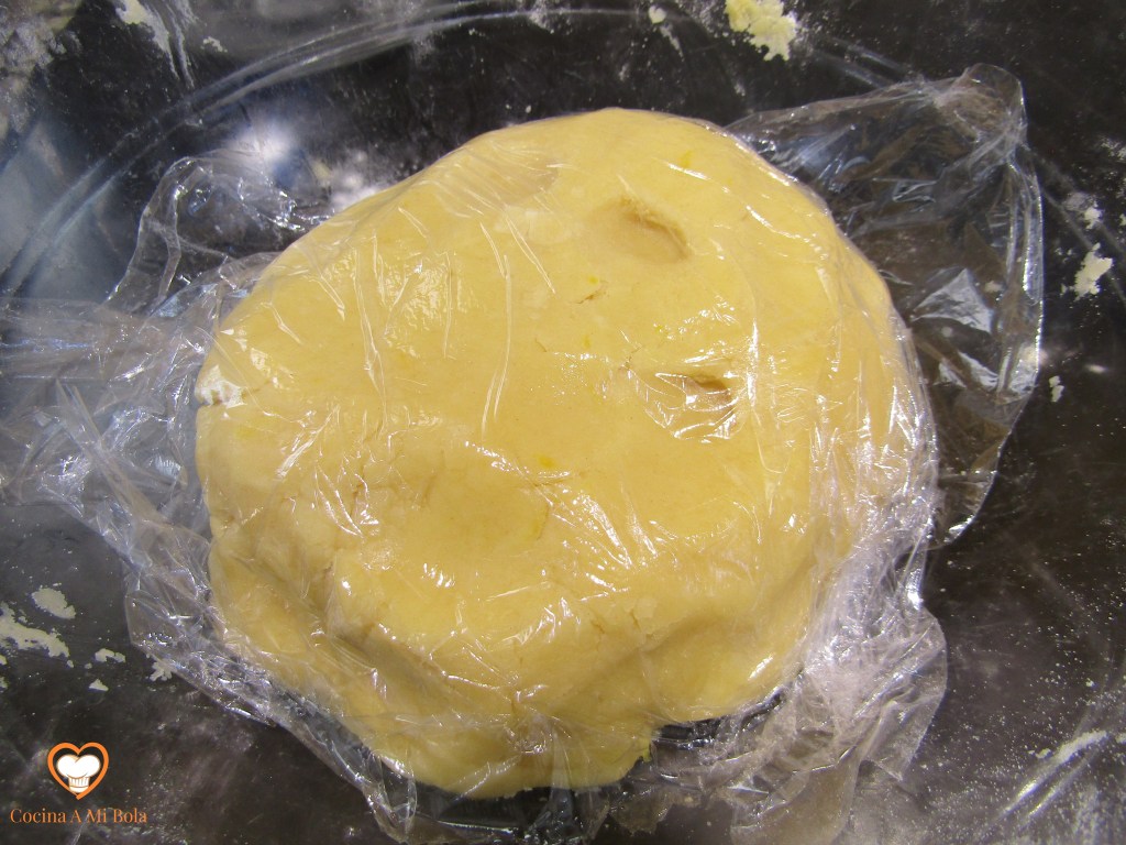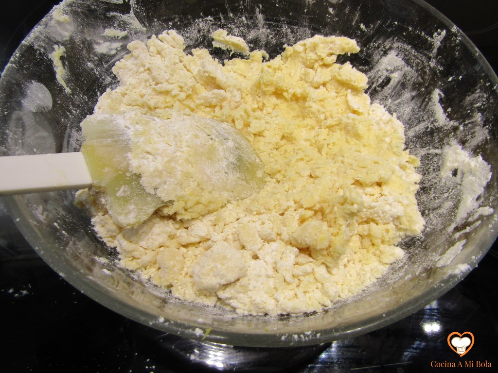 TERCERO.- Poco a poco vamos incorporando la harina sin dejar de hacer movimientos envolventes de fuera hacia dentro y de abajo hacia arriba hasta que se vaya integrando en la masa. Y cuando hayas echado toda, tendrás que amasar a mano un minutillo para ir deshaciendo grumos gruesos de mantequilla. No se trata de trabajar la masa como haríamos para hacer pan. El objetivo es que la harina forme parte de la masa de un modo uniforme. Una vez conseguido, estará preparada porque no tiene que leudar. Su textura es grasienta pero no es elástica, sino quebradiza.