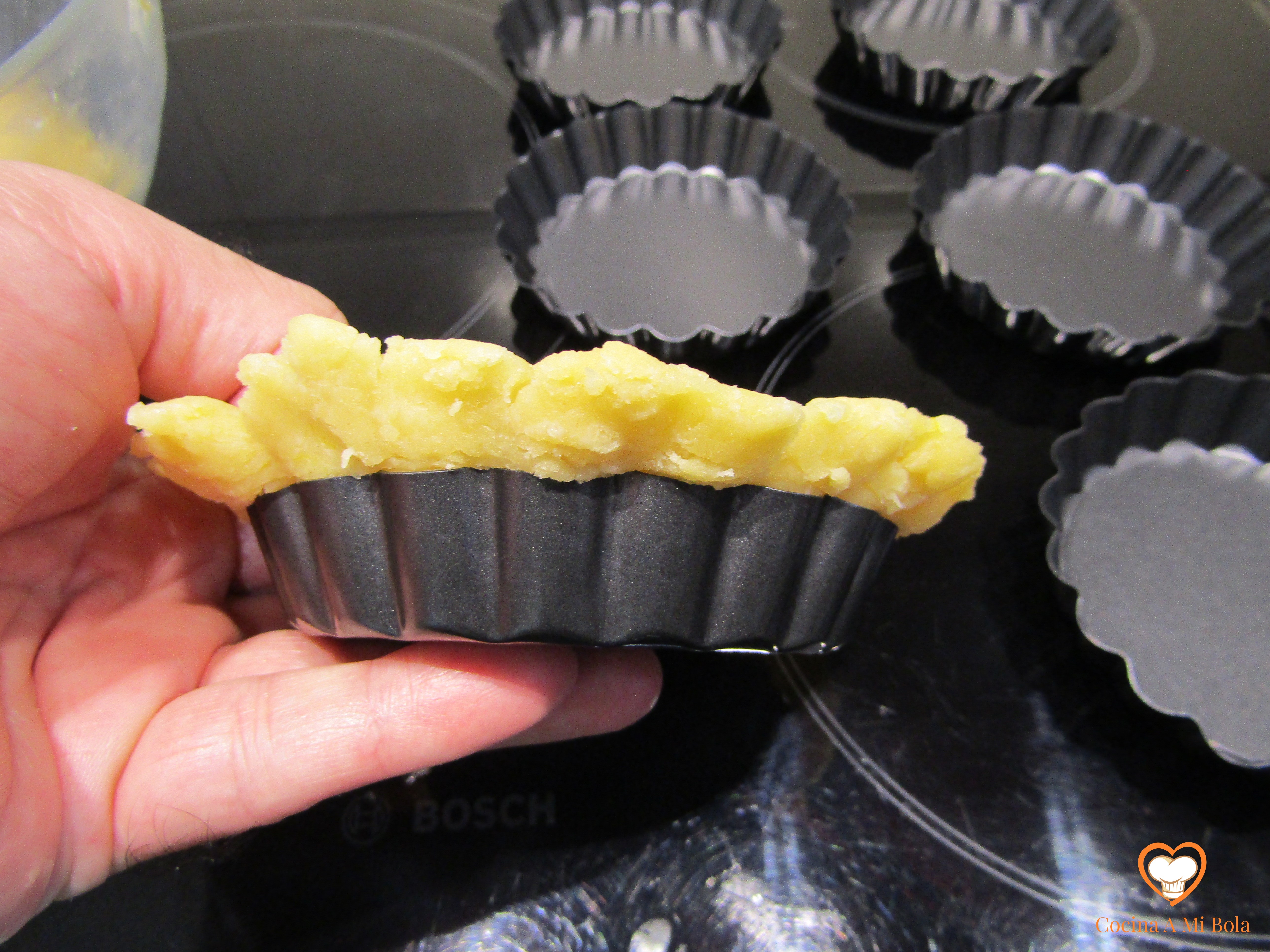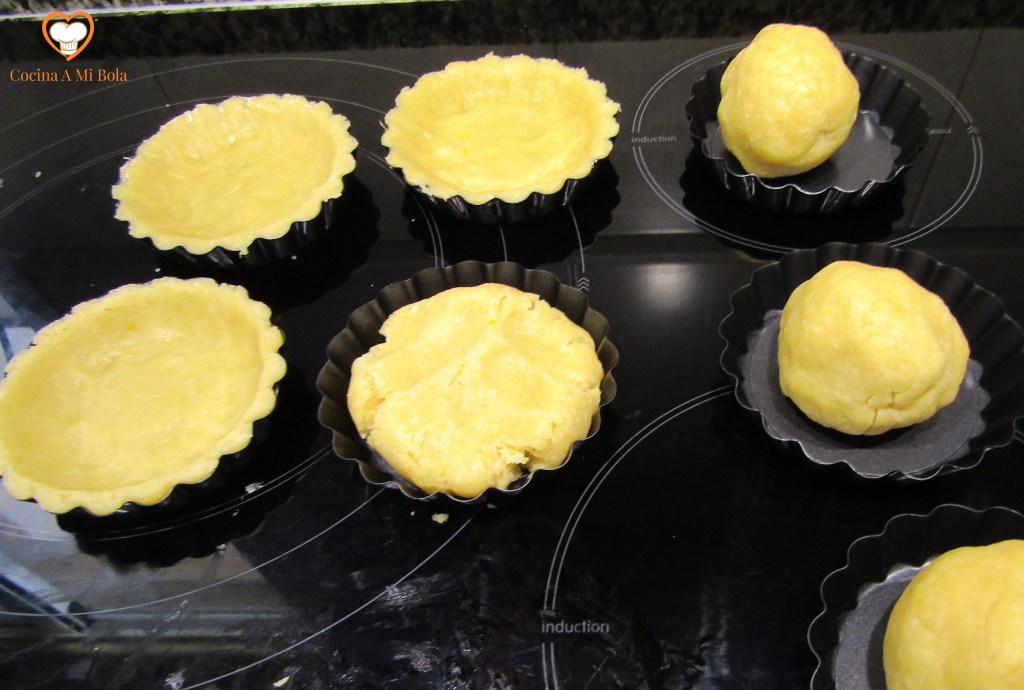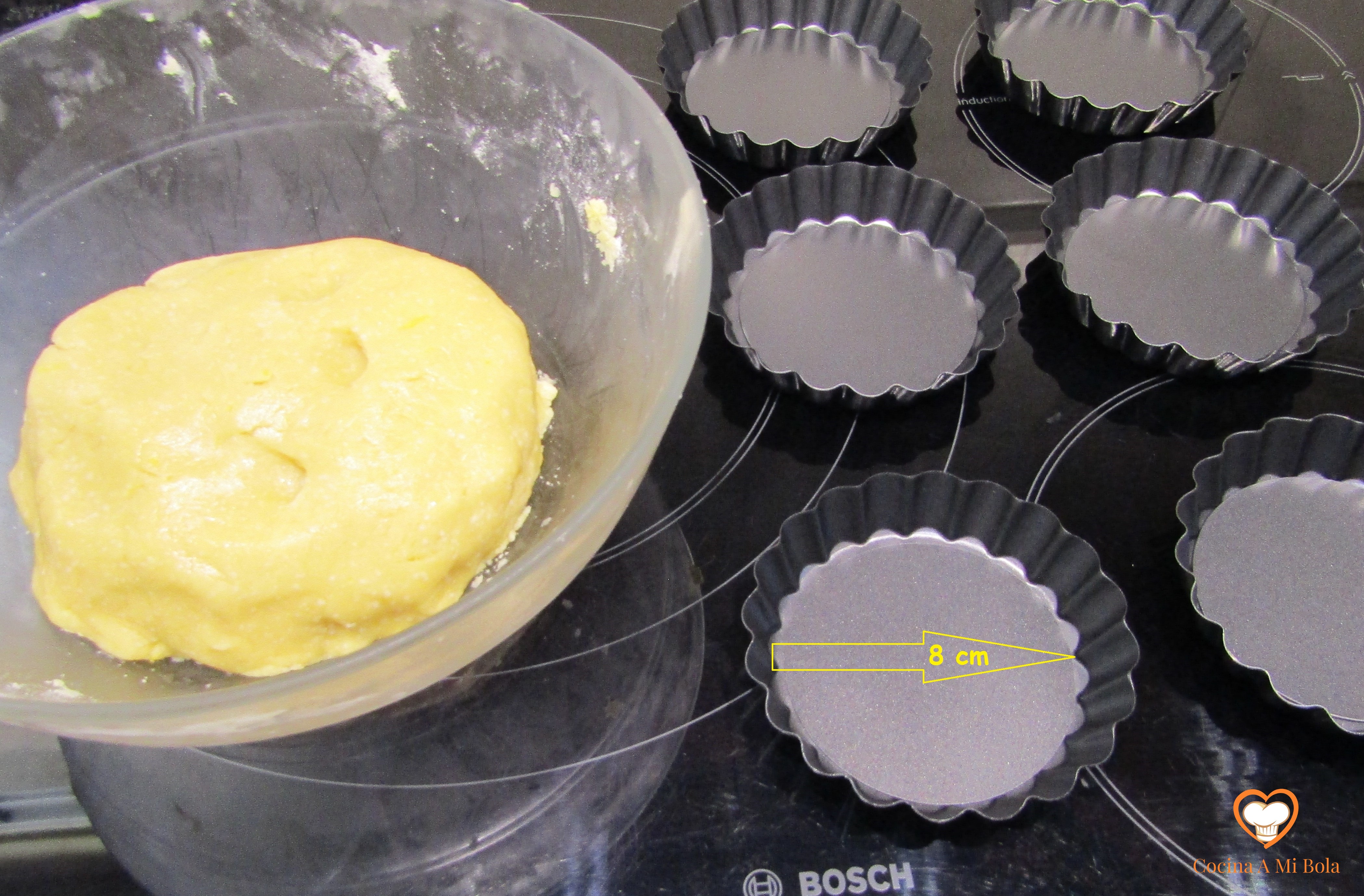 QUINTO.- Transcurrido el tiempo, sacamos la masa y la dividimos en 8 partes aproximadamente iguales. Les daremos forma esférica y, una a una, iremos aplastándolas uniformemente sobre cada molde, ocupando toda su superficie y presionando lo suficiente como para que tome la forma de éste. Pero su grosor deberá ser lo suficientemente grueso como para que sea consistente, y lo suficientemente fino como para que no resulte muy pesada al consumirla. Ten en cuenta que cualquier elaboración hecha sobre una tartaleta, el sabor y cantidad de ésta debe ser lo menos destacado, dejando el verdadero protagonismo al contenido o relleno.
