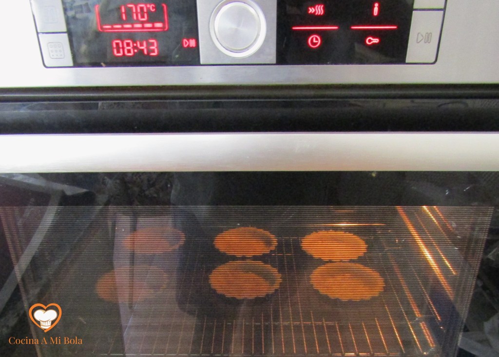 OCTAVO.- Saca los moldes del congelador, pásalos a la bandeja del horno y métela en la parte inferior de éste durante unos 20 minutos. No te fíes demasiado de estos tiempos porque son orientativos y estos corresponden al mío. En todo caso, cuando veas que ya toman cierto tono dorado, ya puedes sacarlo, porque empezarán a endurecerse hasta quedarse como piedras.