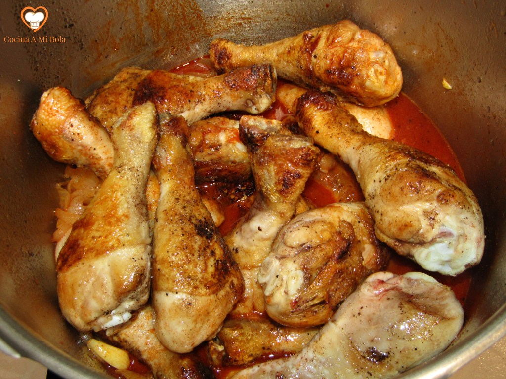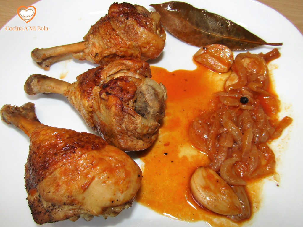 INGREDIENTES: Para 6 personas: 2 kg muslitos de pollo, 3 ó 4 cebollas grandes, 12 dientes de ajo, pimienta negra en grano y molida, pimentón ahumado, aceite de oliva virgen extra, 250 ml vinagre de Jerez, 100 ml Jerez seco, 2 hojas de laurel, tomillo, 1 clavo y sal.