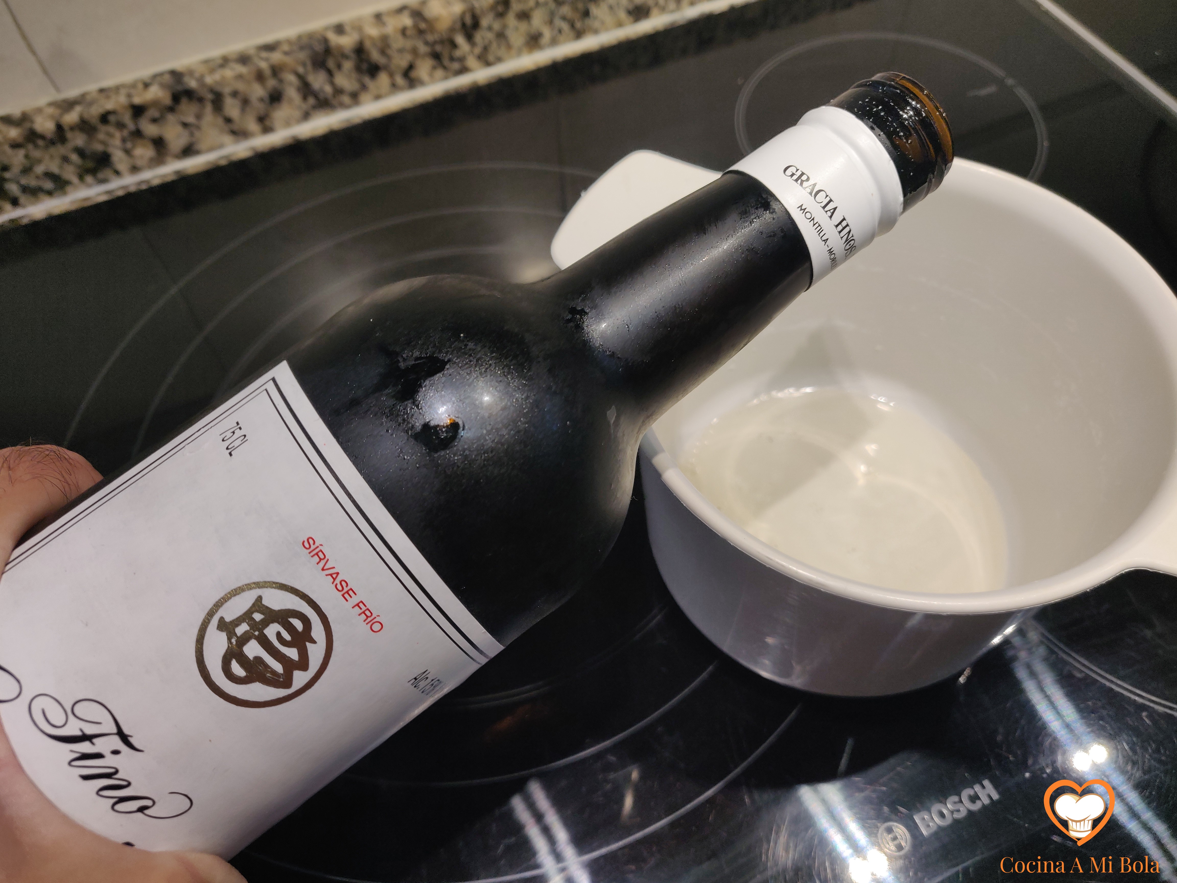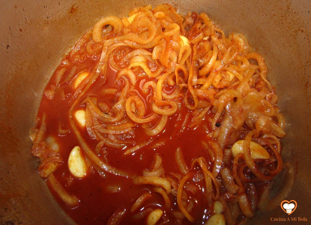 SEXTO.- Cuando la cebolla y los ajos estén tiernos, retiramos momentáneamente la olla del fuego y echamos una cucharadita (de postre) de pimentón ahumado, removiendo para que se distribuya bien. Ahora, devolvemos la olla al fuego, añadimos el Jerez, removemos de nuevo y al cabo de un par de minutos, agregamos el vinagre. Pasados otros dos minutos, añadimos medio vaso de agua.
