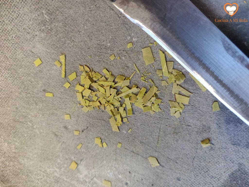 SEGUNDO.- Vamos a echar una hoja de laurel seca y para que se triture bien y no percibamos trocitos en la boca, vamos a eliminar el nervio central de la hoja con un cuchillo afilado. Y ahora lo cortamos en trocitos muy pequeños para echarlos también en el vaso.