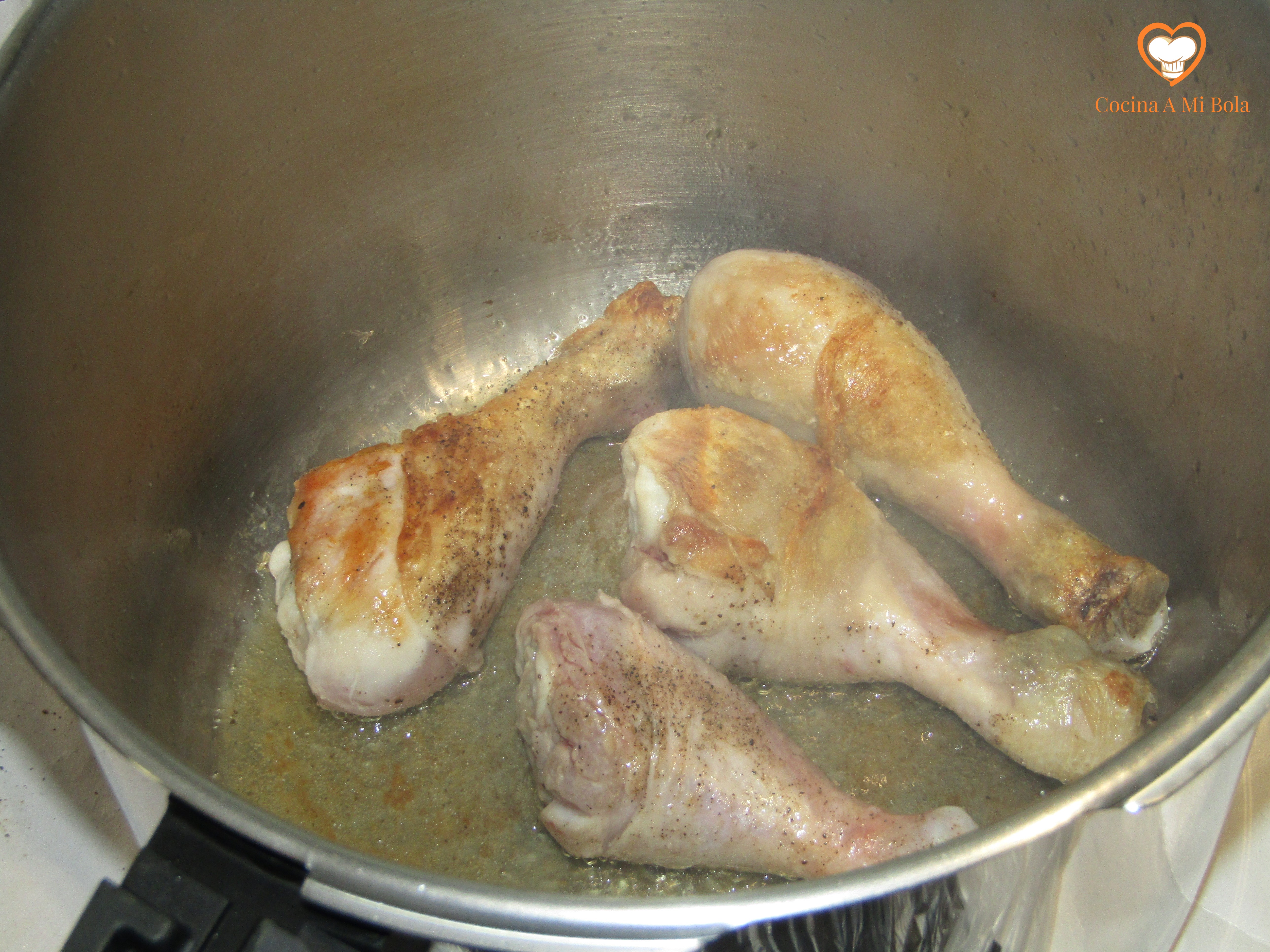 SEGUNDO.- Cubriremos el fondo de la olla express con aceite de oliva virgen extra; dejaremos que se caliente e iremos dorando los muslos en varias tandas para no perder temperatura. Pretendemos que se doren e incluso se tueste la piel, así que no tengas prisa y dales la vuelta para que se hagan por todas partes. Es probable que tengas que añadir algo de aceite, pero no te excedas. Mira la foto. Los vamos sacando y reservando.