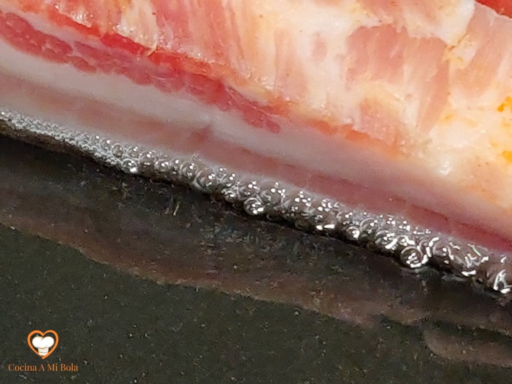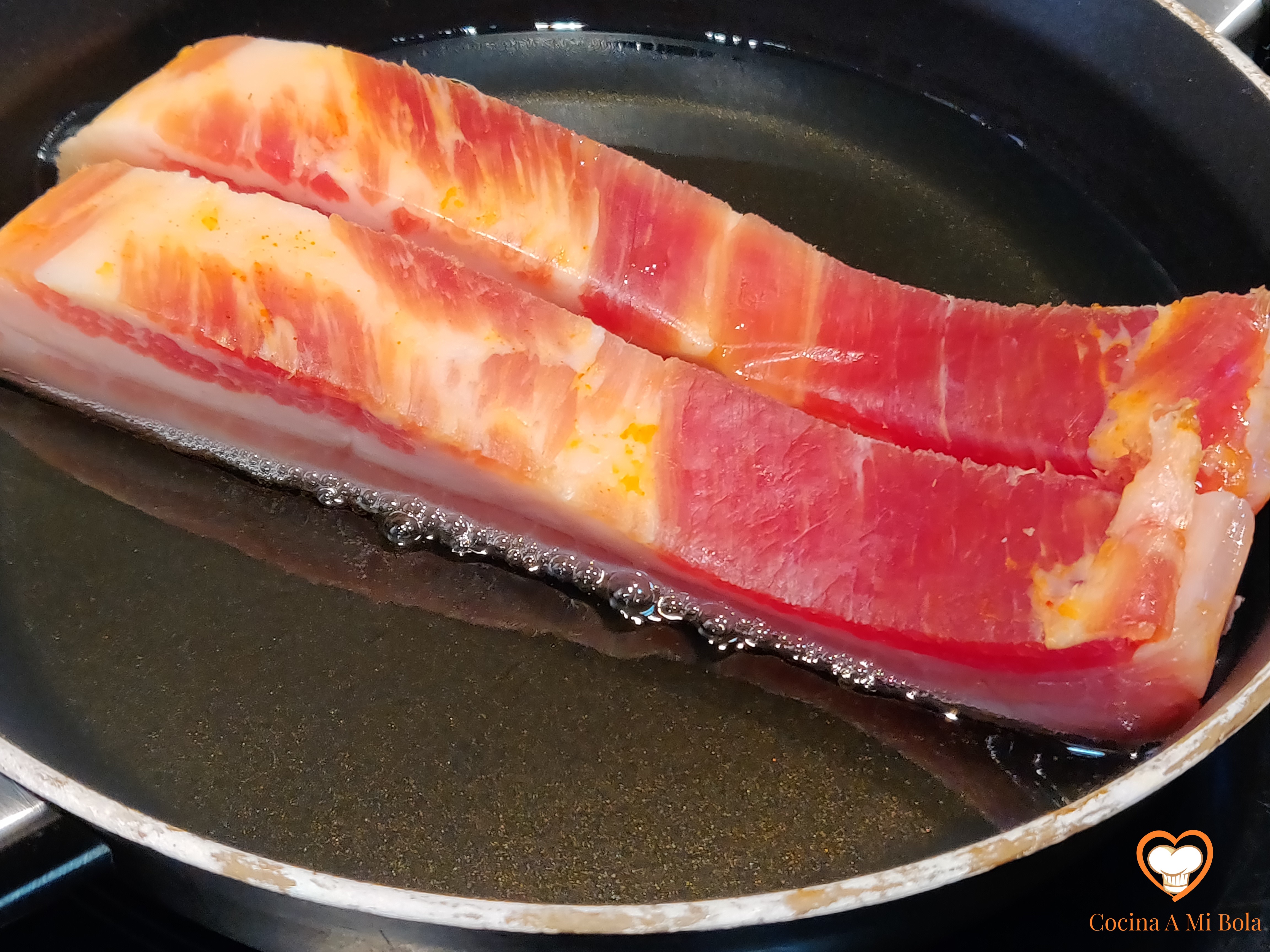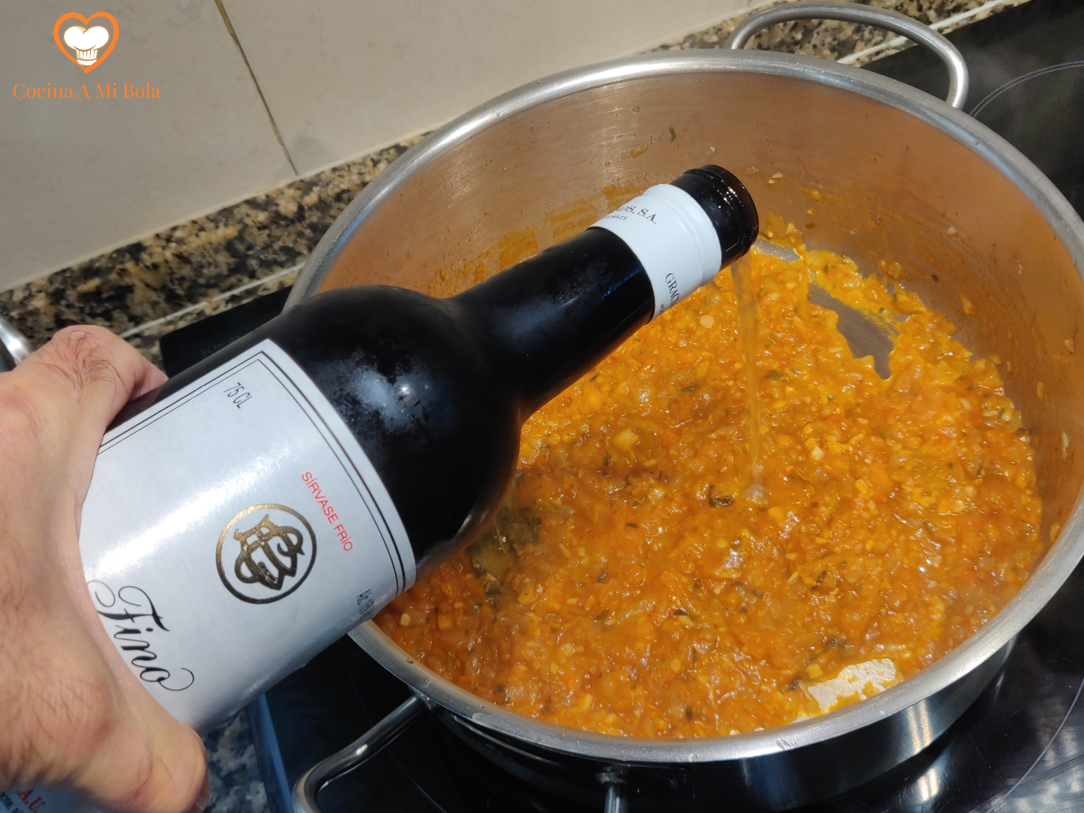 QUINTO.- Al cabo de unos diez minutos, el tomate ya estará guisado, así que echa sobre el sofrito una cucharadita rasa de pimentón dulce ahumado. Remueve y agrega el vino fino al cabo de un minutillo. Remueve y deja que rehogue y evapore el alcohol.