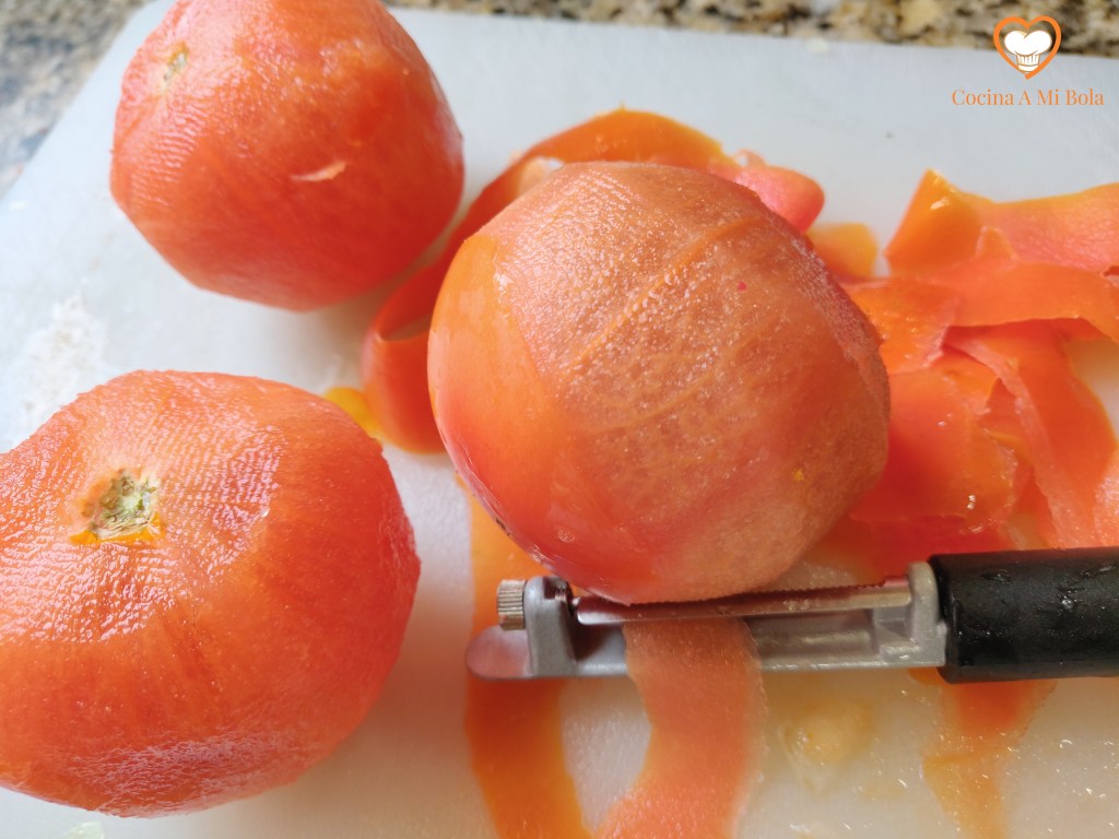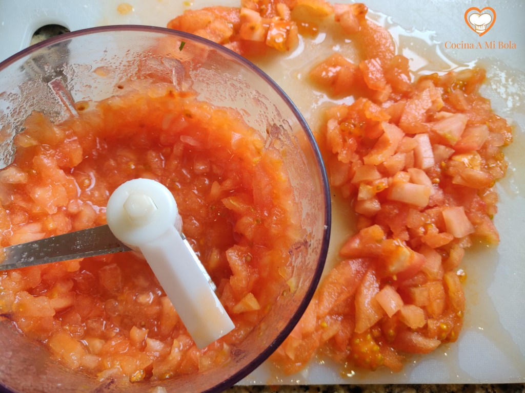 SEGUNDO.- Mientras se van haciendo la cebolla y el ajo, pela los tomates, córtalos en cuadraditos y pásalos ligeramente por una picadora, es decir, que le des un triturado suave sin que se convierta en puré. Mira la foto. Salpimenta, teniendo en cuenta que ya lo has hecho con la cebolla y aún lo harás otra vez con el choco y la patata. Pero sé consciente desde este momento que debes ir probando para no salar en exceso y si el caldo de pescado es concentrado, mucho cuidado porque suelen ser muy intensos.