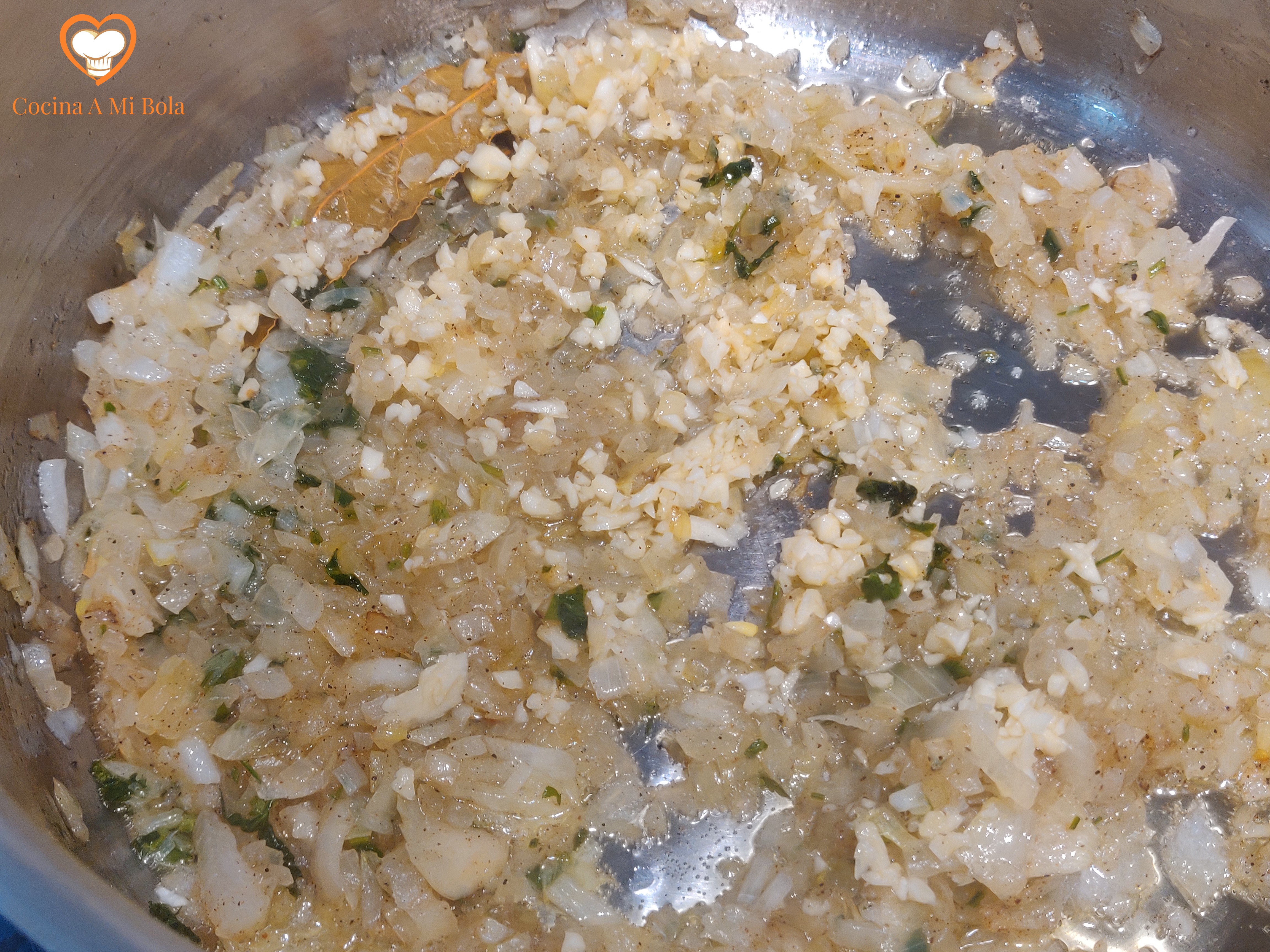PRIMERO.- Pela las cebollas, pícalas fino y ponlas a pochar con aceite de oliva virgen extra a fuego lento en la olla o cazuela donde vayas a hacer el guiso. Salpimenta, añade un par de hojas de laurel y al cabo de unos cinco minutos, añade tanto el ajo como el perejil, picados. Remueve de vez en cuando y deja que se vaya cocinando.