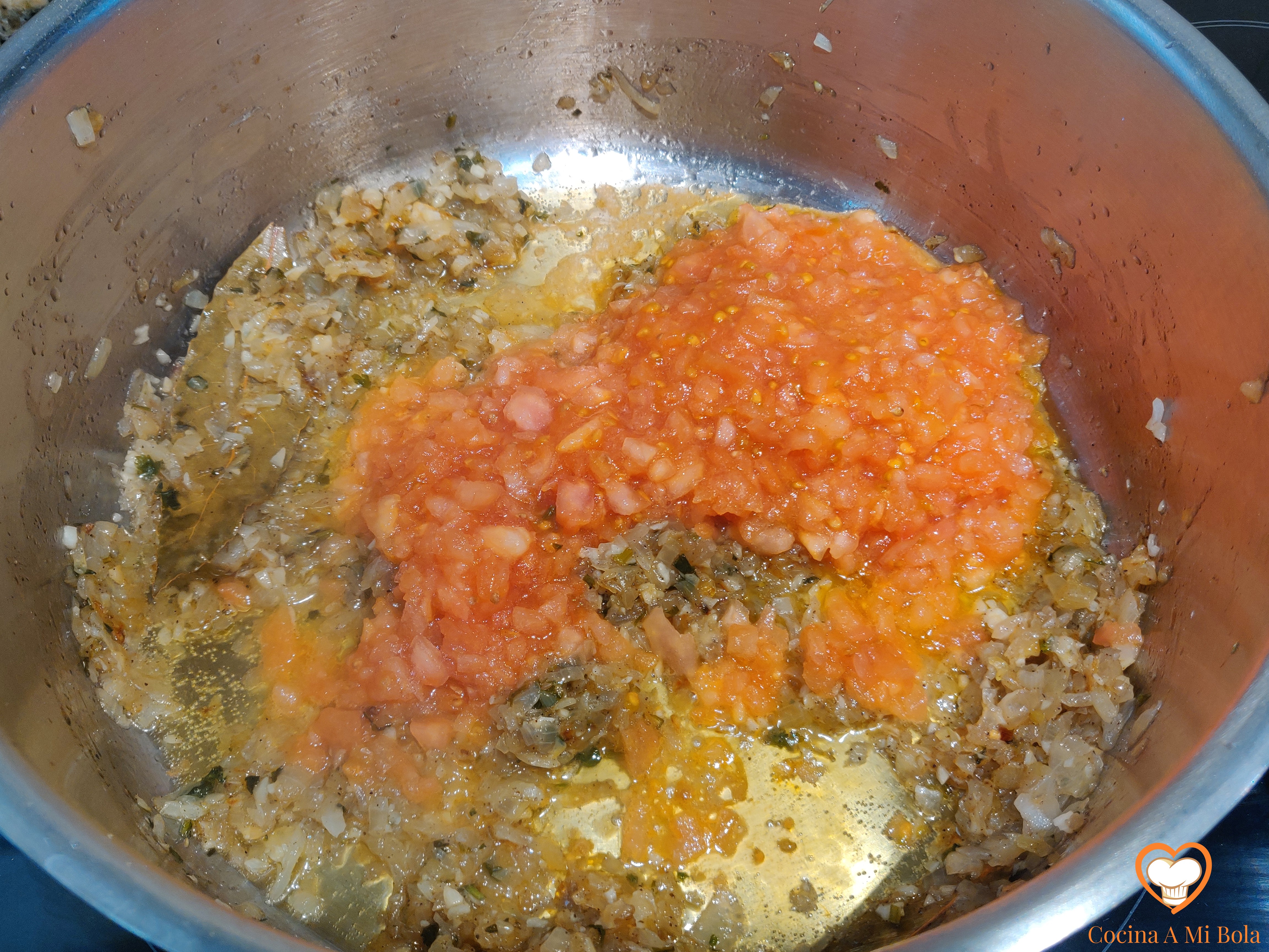 TERCERO.- Cuando la cebolla esté tierna y transparente, sube el fuego y vuelca el tomate triturado para volverlo a poner al mínimo en cuanto comience el hervor.