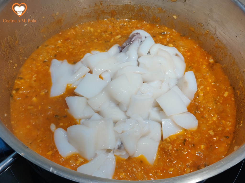 SEXTO.- Incorpora la sepia cortada y rehoga dos minutos, tras lo cual, echamos 750 cc de caldo de pescado y dejamos que hierva a fuego moderado durante unos 10 minutos. Yo suelo utilizar fumet de pescado que hago yo en casa (sin sal) y congelo. Vuelvo a advertirte respecto a la sal si usas caldo concentrado, porque es bastante salado.