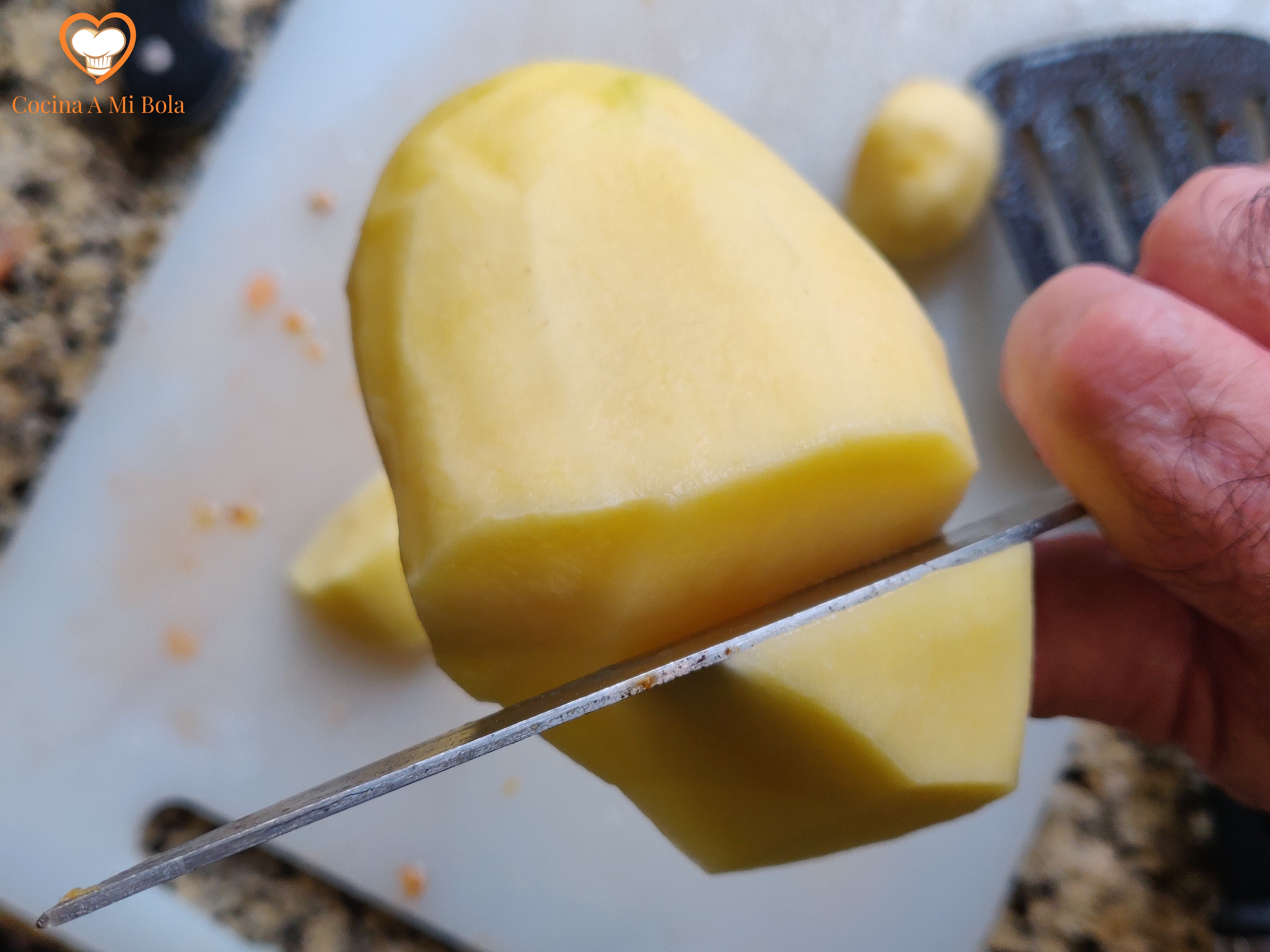 SÉPTIMO.- Durante este tiempo, pelamos las patatas y las tronzamos en trozos del tamaño de un bocado. “Tronzar” es arrancar los trozos haciendo un corte con el cuchillo hasta la mitad y en ese punto, en vez de continuar, hacemos palanca hacia fuera de modo que el trozo quede arrancado, roto y no con un corte limpio. Esto es importante porque de ese modo, la patata expulsará mejor su almidón al guiso, lo que nos ayudará a espesar el caldo.