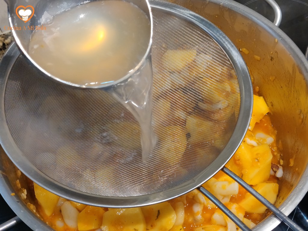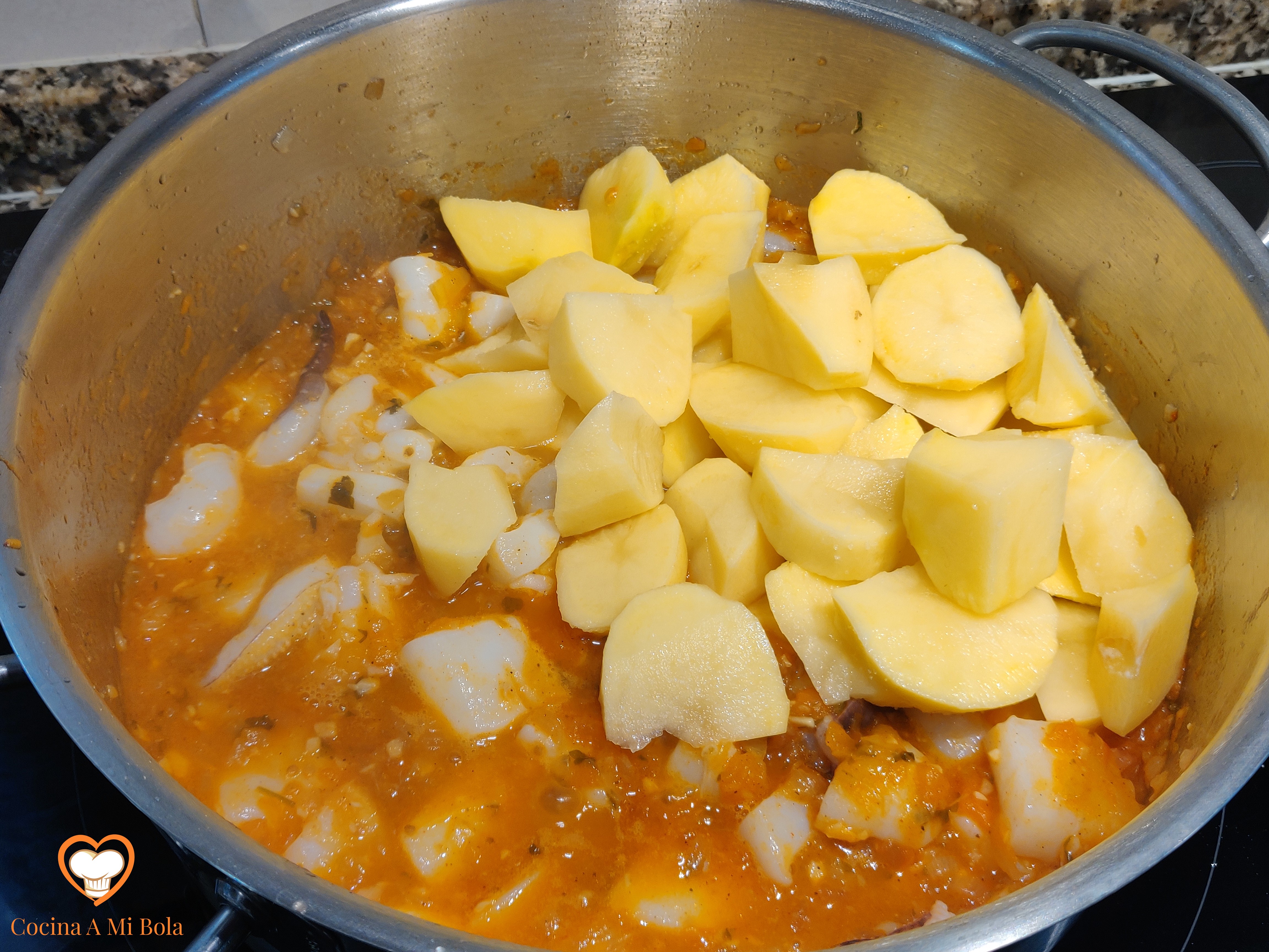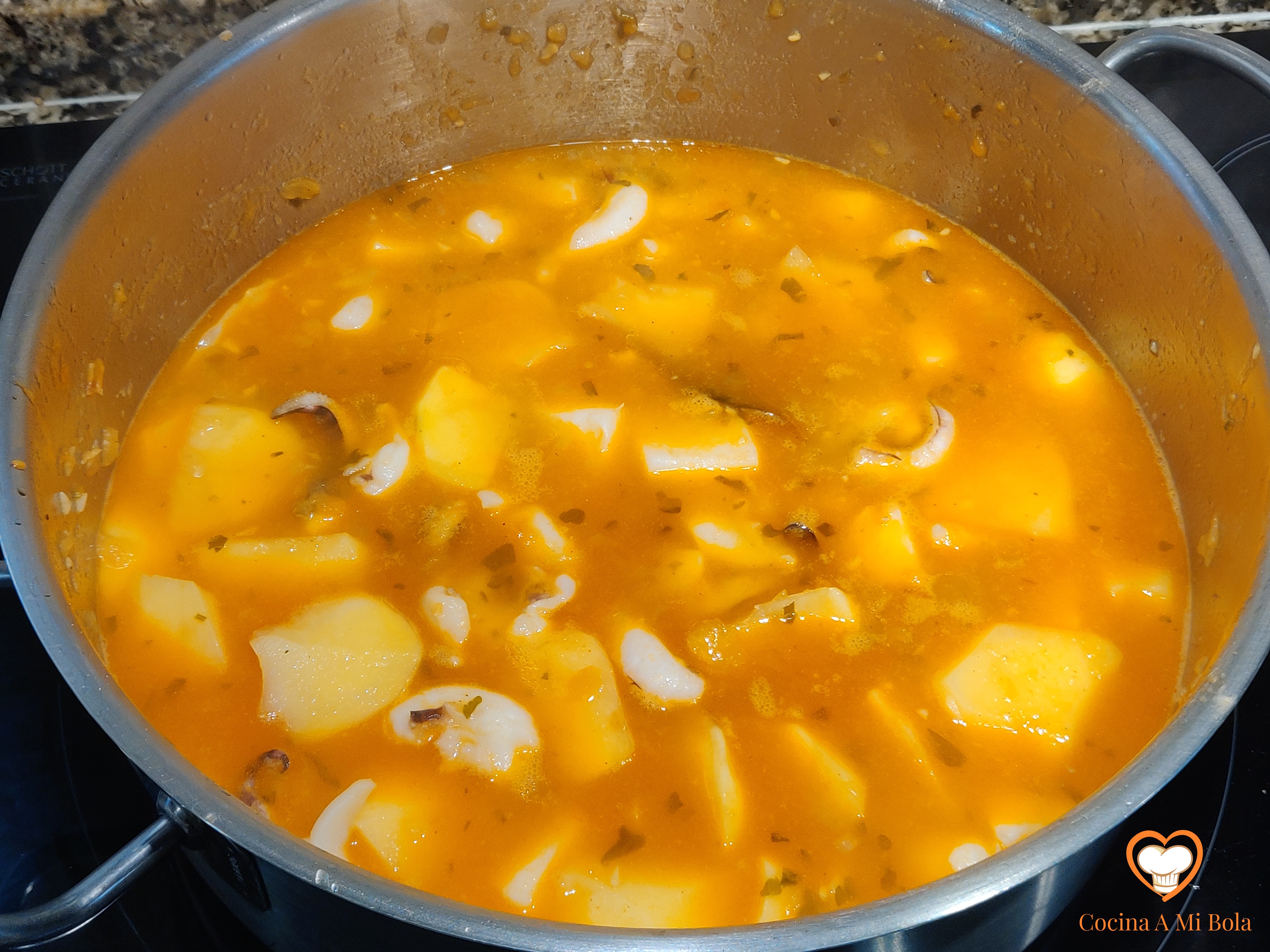 OCTAVO.- Pasados los 10 minutos (que es el tiempo de más que el choco necesita cocer), agregamos las patatas y el resto del caldo. Salpimentamos por última vez y con precaución (ve probando….). Fuego intenso hasta que hierva y luego lo bajamos. En otros 10 minutos, más o menos, las patatas ya estarán blandas, pero déjalas algún minutillo más para que “se pasen” un poquito de cocción y de ese modo tengamos una salsa bien densa. Remueve con energía y apaga el fuego. Si te gusta más líquida, sólo tienes que añadir más caldo de pescado o algo de agua.