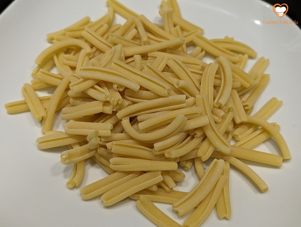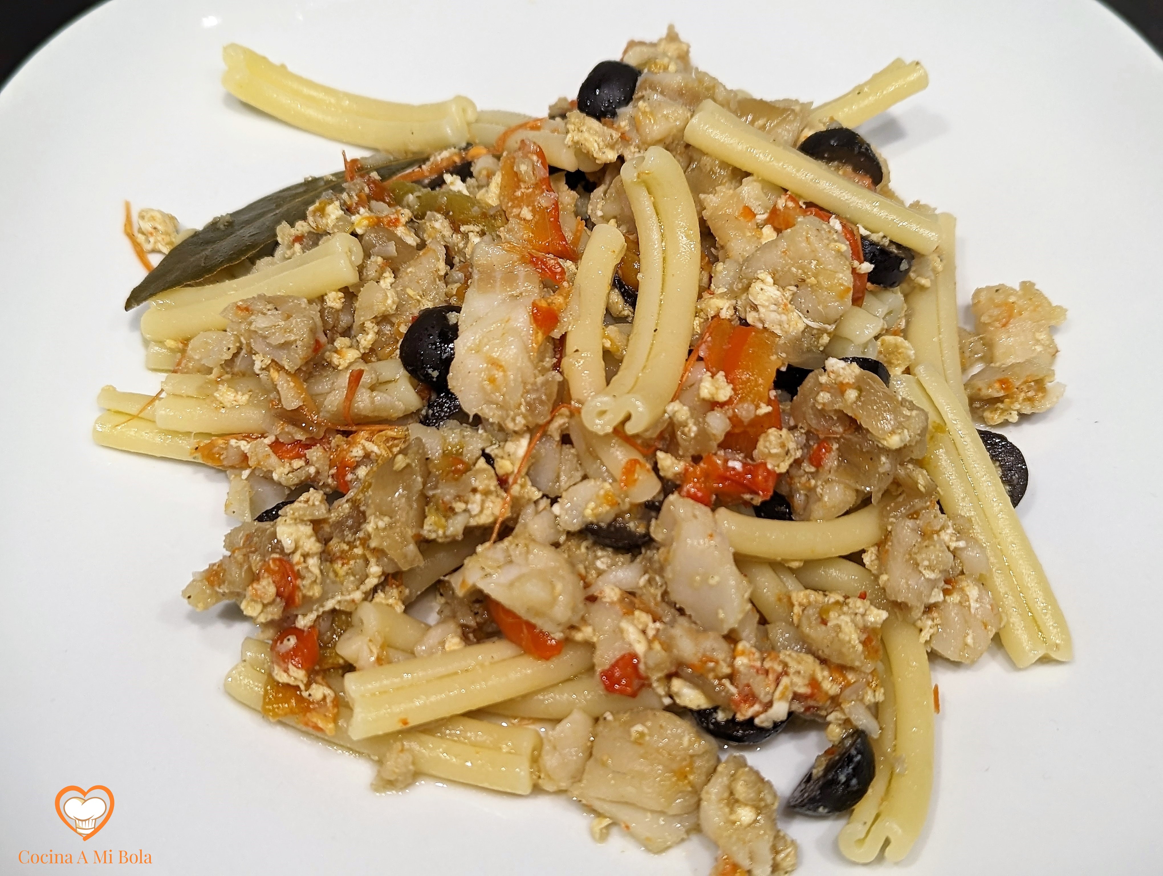 INGREDIENTES: Para 2 personas: 220 gr Caserecce (u otra pasta similar), 500 gr de migas de bacalao desalado, 1 cebolla, 1 pimiento rojo de asar, 100 gr aceitunas negras deshuesadas, 2 huevos, 2 hojas de laurel, pimienta negra molida, aceite de oliva y sal.