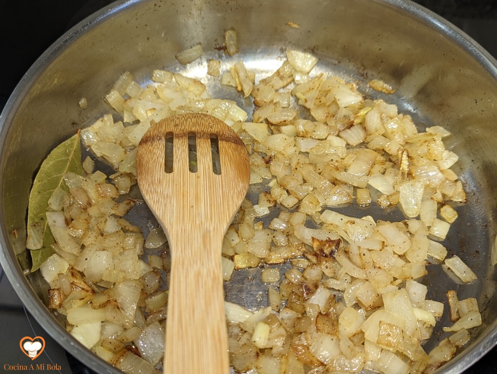 PRIMERO.- Pela la cebolla, córtala en trocitos pequeños y ponla a pochar en una cazuela o sartén honda con poco de aceite de oliva. Sin que se queme, deja que se tueste un poco. Salpimenta ligeramente.