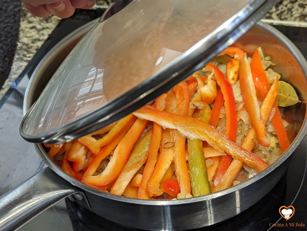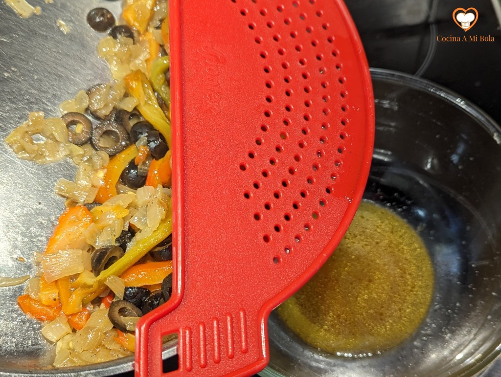 TERCERO.- Una vez esté la verdura tierna escurrimos el jugo y lo reservamos momentáneamente. A mí me justa que el pimiento quede algo más entero, pero eso lo dejo a tu gusto y a tu criterio.