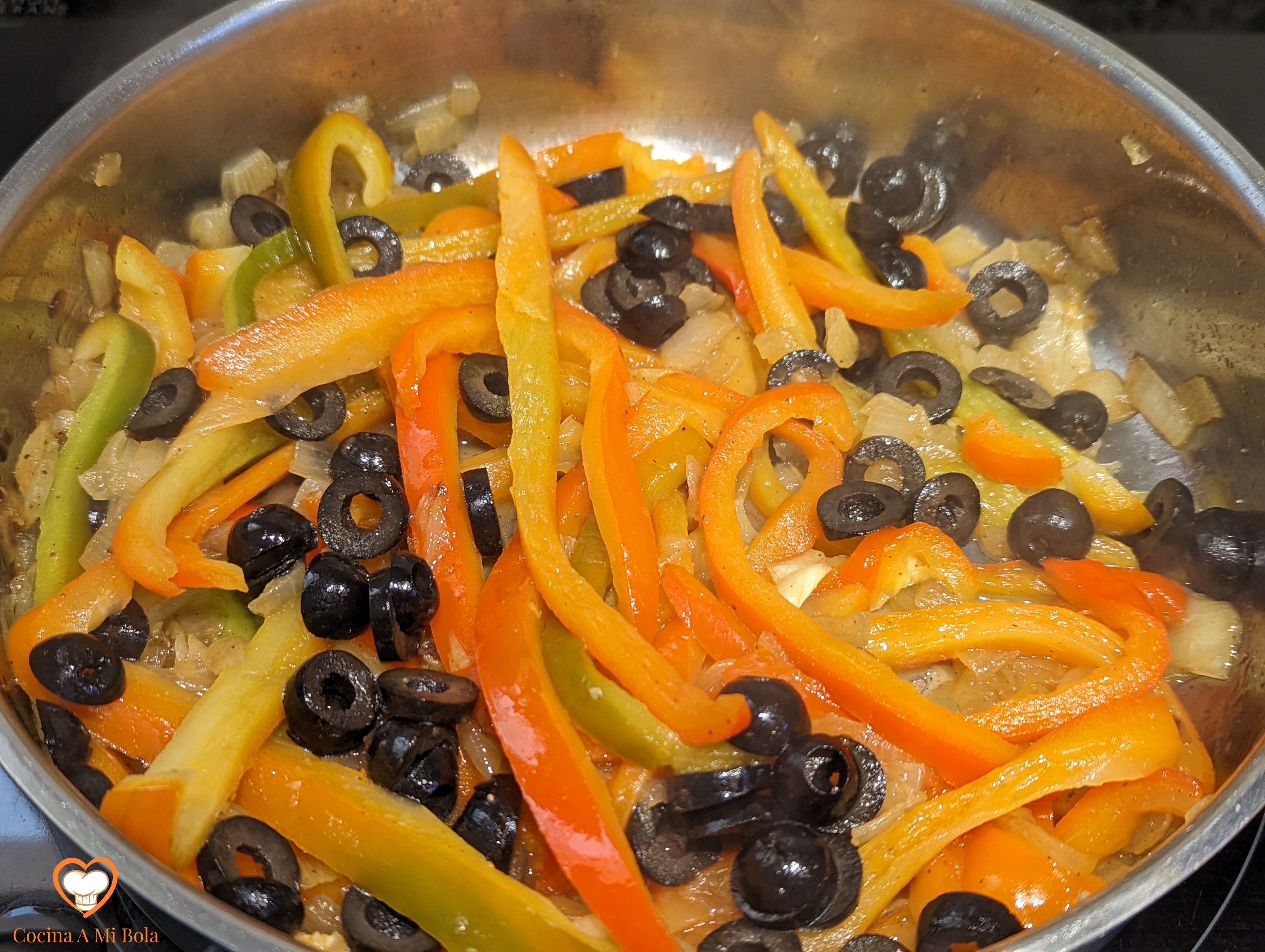 SEGUNDO.- Mientras se va haciendo la cebolla, lava y corta en tiras el pimiento rojo para incorporarlo a la cazuela. Pon la tapa y deja que se haga despacio. Ponemos la tapa para que no se evapore el abundante jugo que el pimiento nos dejará y que usaremos después. Corta las aceitunas en rodajitas e incorpóralas.