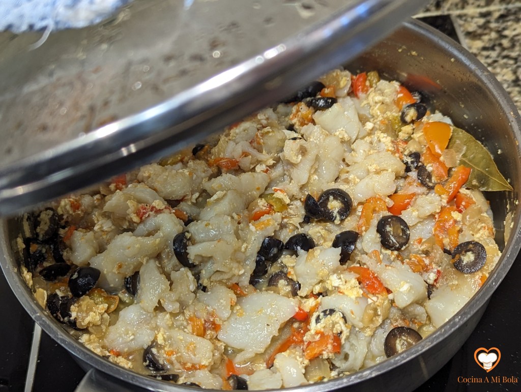 QUINTO.- Pimentamos el bacalao, lo probamos y rectificamos de sal si fuera preciso, (ya que es desalado y podría estar demasiado fuerte) y lo incorporamos a la cazuela. Mezclamos bien con mucho mimo para que el pescado no se deshaga más y ponemos la tapa dejándolo unos 3 ó 4 minutos para que se cocine.