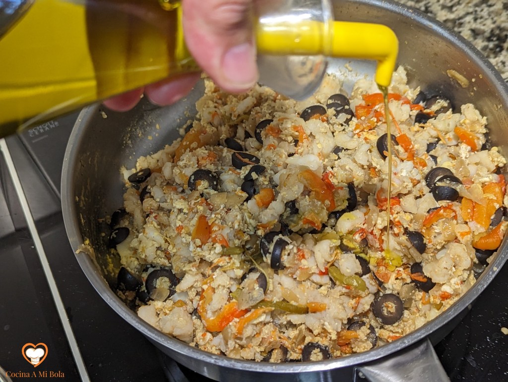 SEXTO.- Apaga el fuego, escurre en un recipiente el jugo que ha soltado el bacalao; rocíalo con un finísimo hilo de aceite de oliva virgen extra mientras lo mueves con sumo cuidado y déjalo reposar con la tapa puesta.