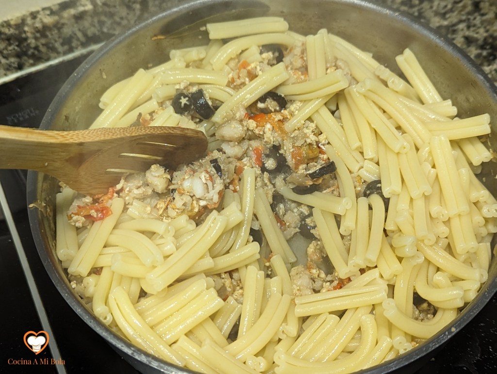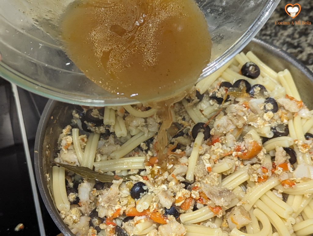 SÉPTIMO.- Pon agua abundante a hervir en una cazuela con sal y un par de hojas de laurel a la que agregaremos el jugo del pescado que acabamos de escurrir. Una vez alcance el hervor, baja un poco el fuego, tápala y déjala así durante un par de minutos para que el laurel infusione el agua. Cuece la pasta según las indicaciones del fabricante o, como siempre, pruébala hasta que esté a tu gusto.