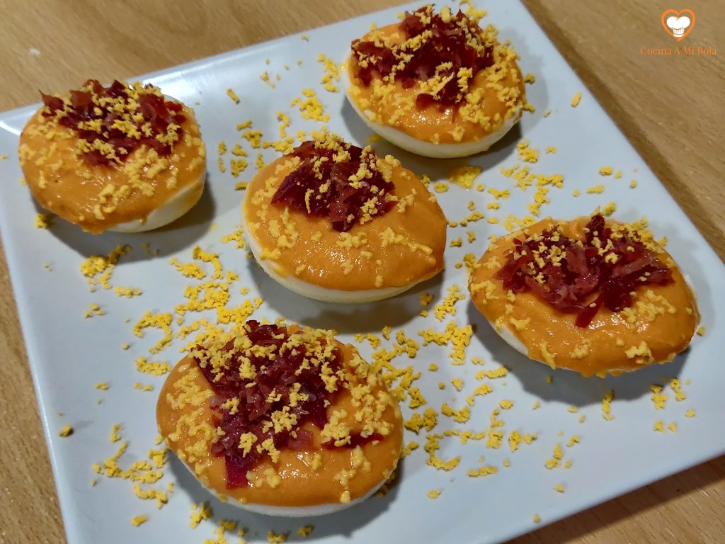 SEXTO.- Rellena las medias claras con el salmorejo espesado con las yemas y colócalas sobre una fuente. Decora con el jamón triturado y con la yema que teníamos reservada, rallándola por encima.