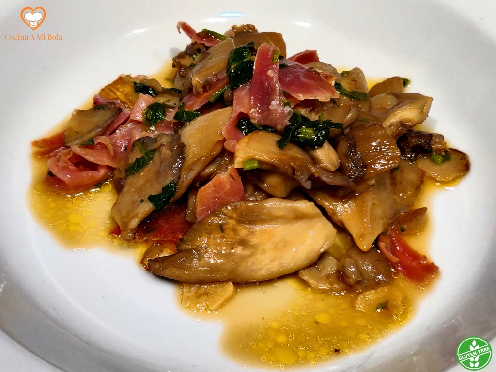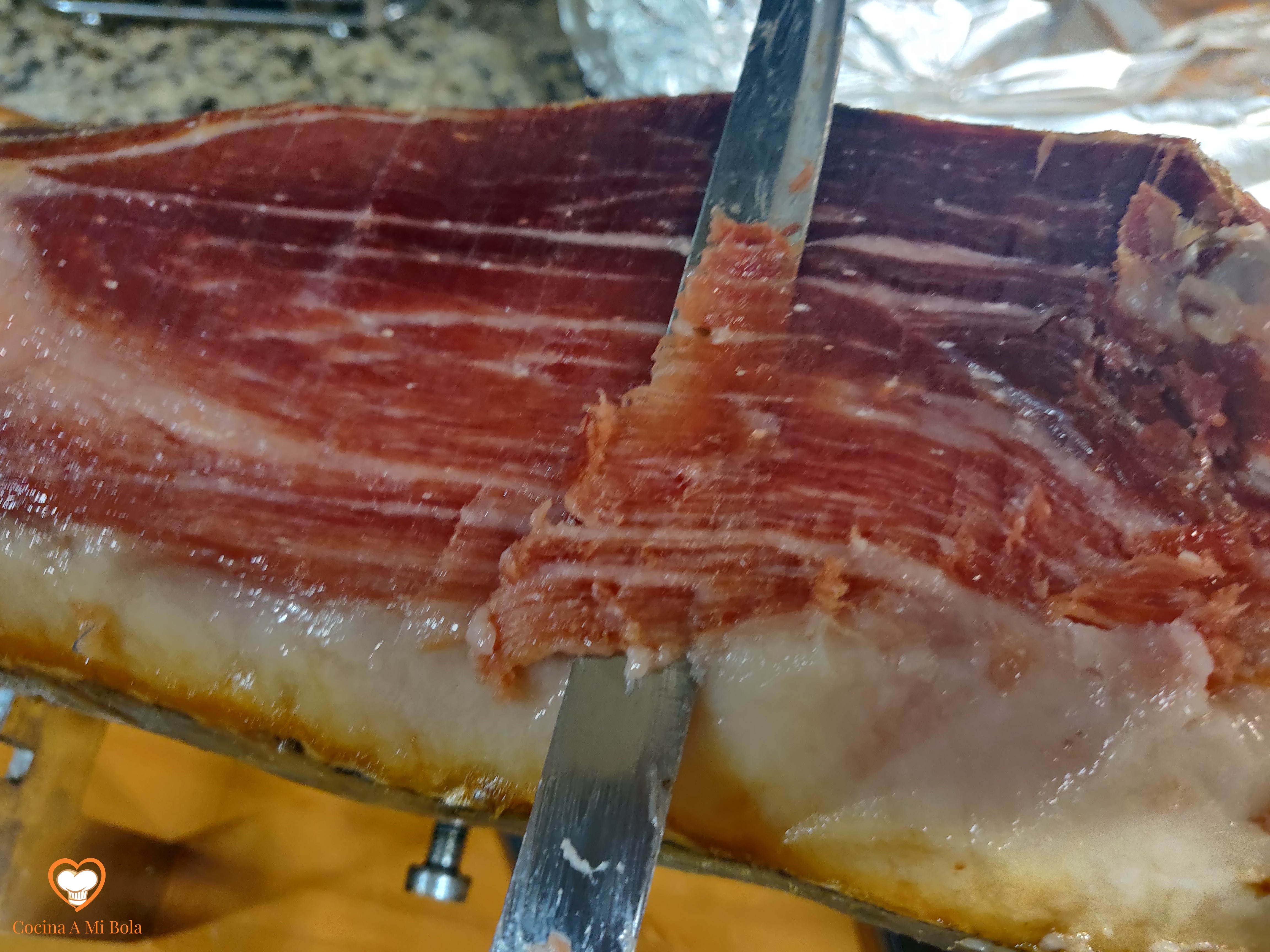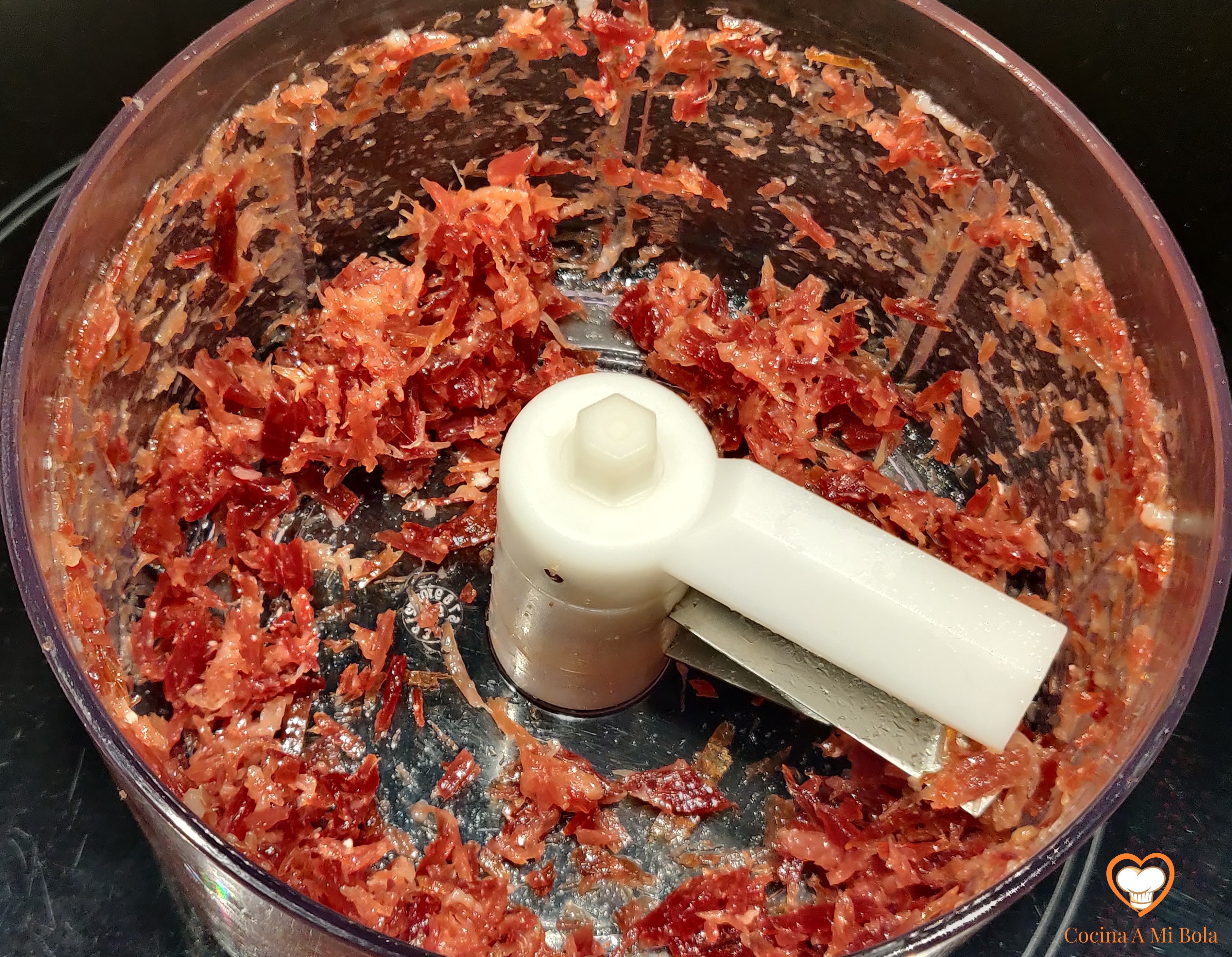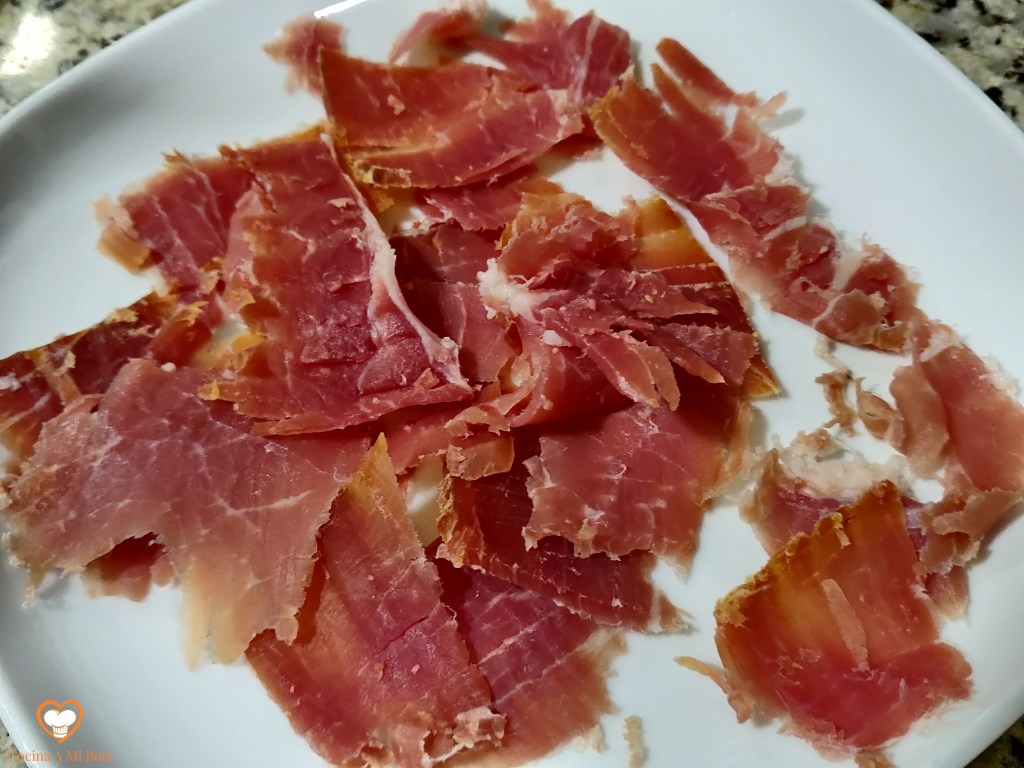 QUINTO.- Corta unas lonchas de jamón de la pata o cómpralo al corte. Es importante que sea un jamón ibérico. Ya sé que es caro, pero tan sólo necesitarás unos 80 gramos y la diferencia con un jamón serrano normal es importante. No obstante, también estará muy rico. Tritúralo tal y como ves en la fotografía y reserva.