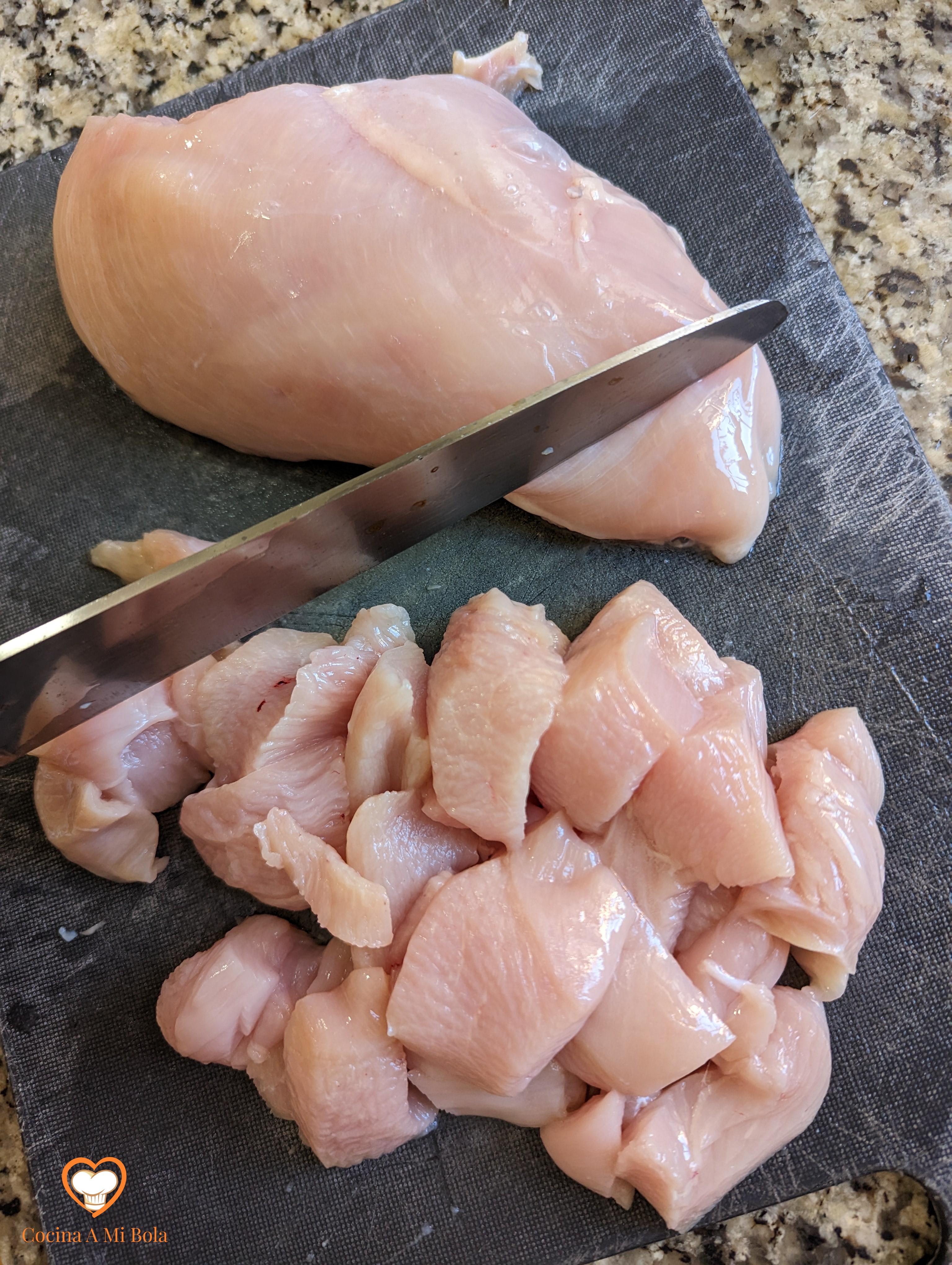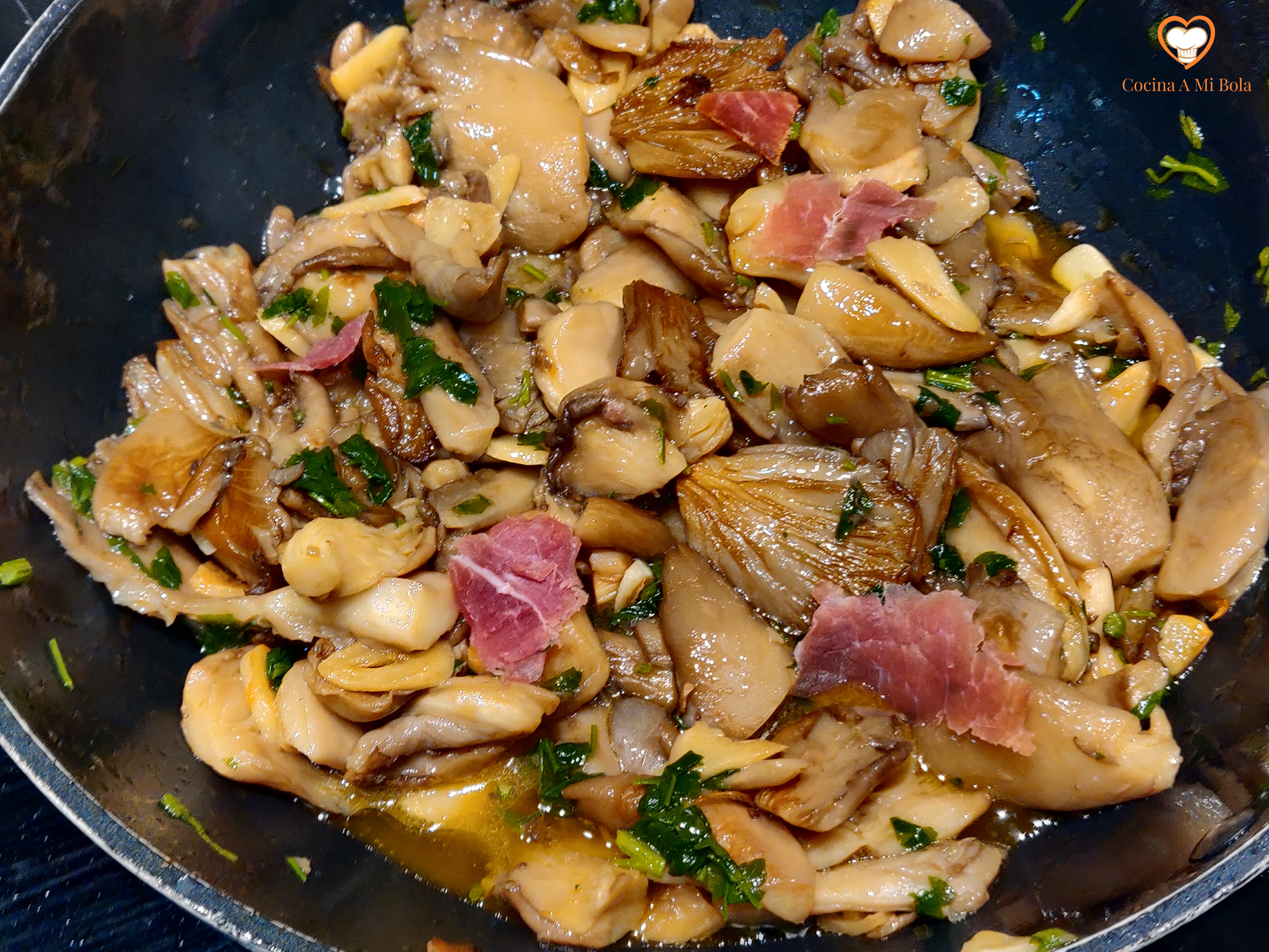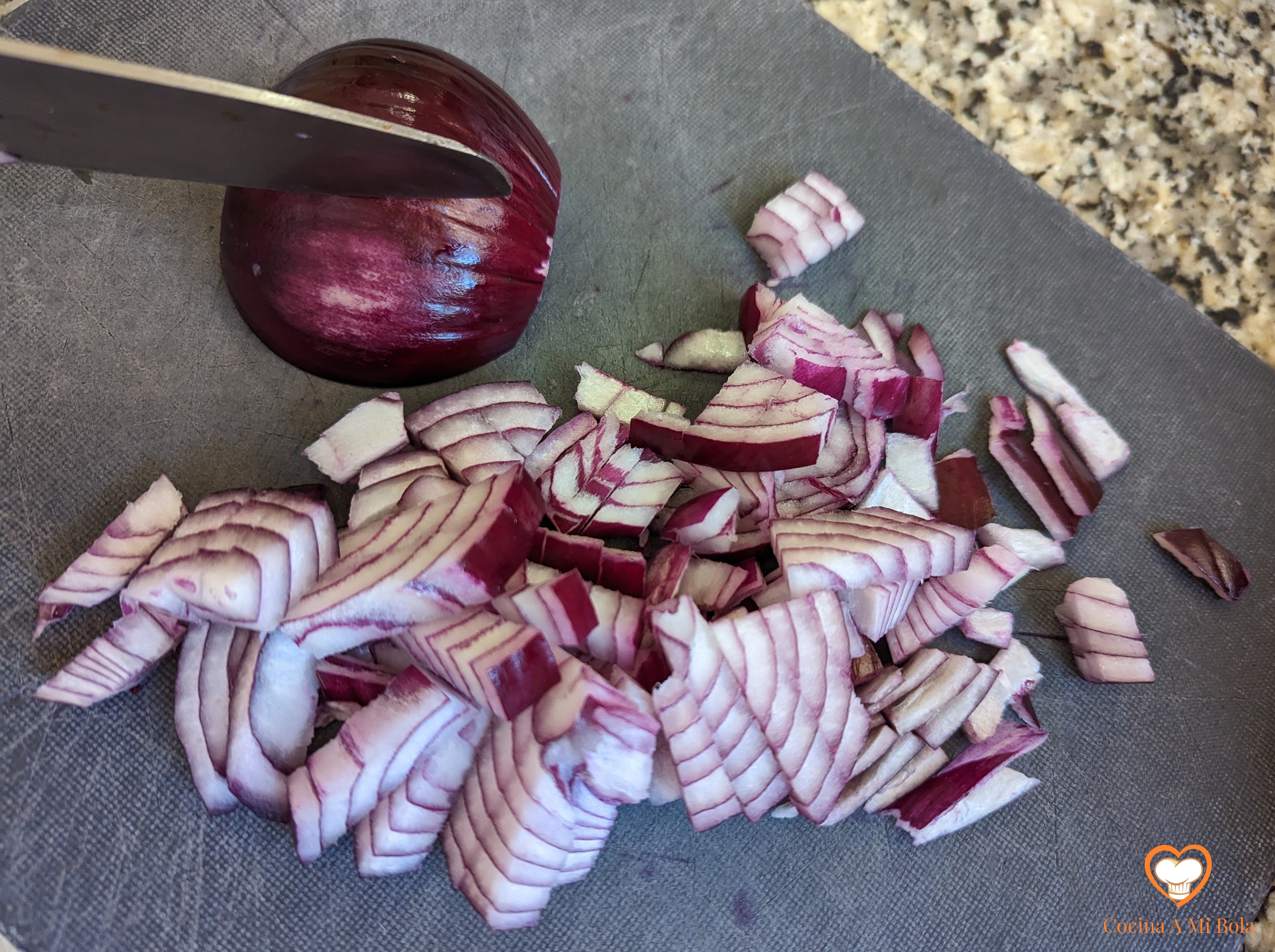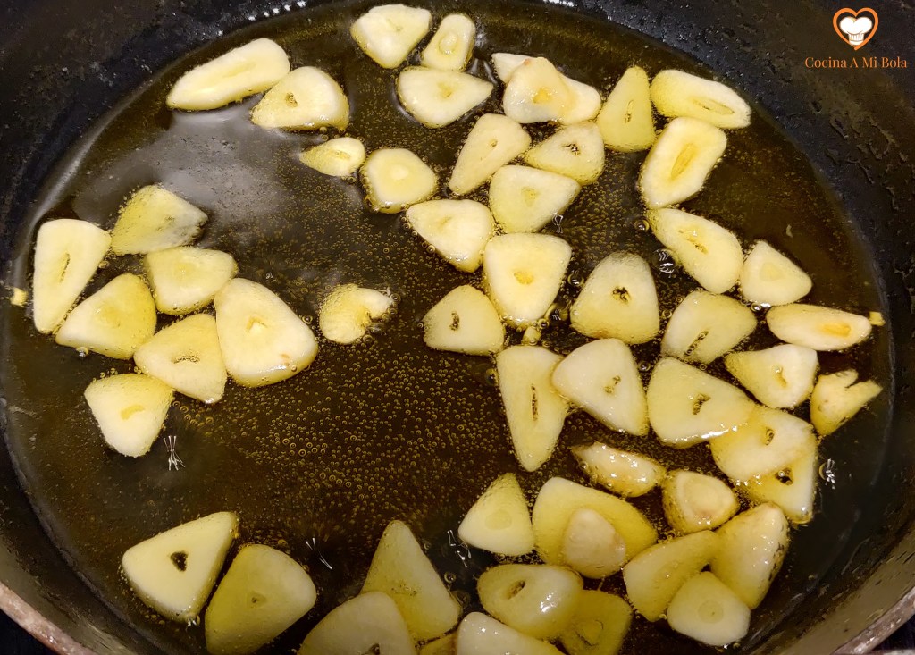 QUINTO.- Corta unas lonchas de jamón de la pata o cómpralo al corte. Es importante que sea un jamón ibérico. Ya sé que es caro, pero tan sólo necesitarás unos 80 gramos y la diferencia con un jamón serrano normal es importante. No obstante, también estará muy rico. Tritúralo tal y como ves en la fotografía y reserva.