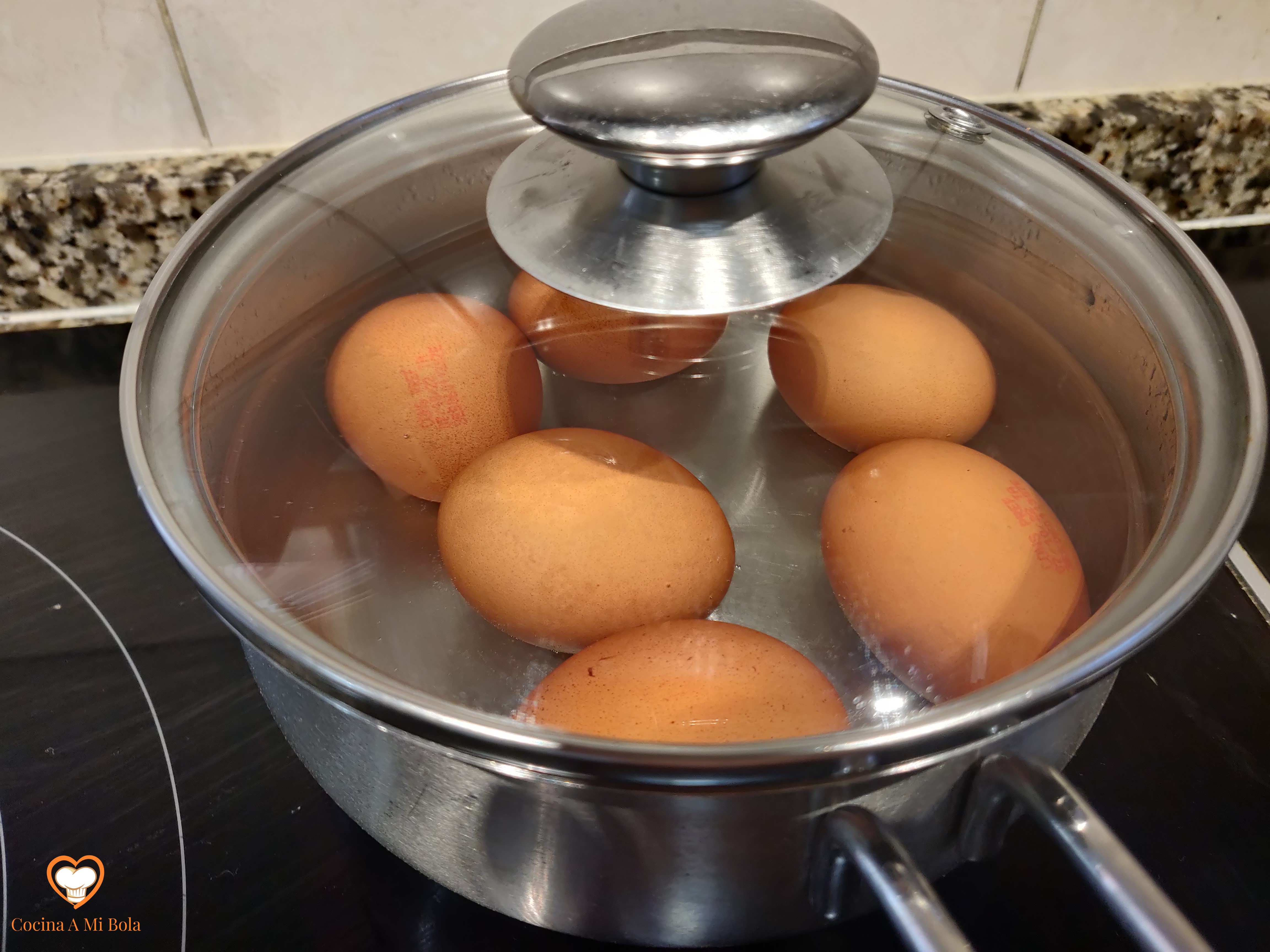 SEGUNDO.- Cuece los huevos durante diez minutos a fuego bajo, sin que pare el hervor. Enfríalos y quítales la cáscara.