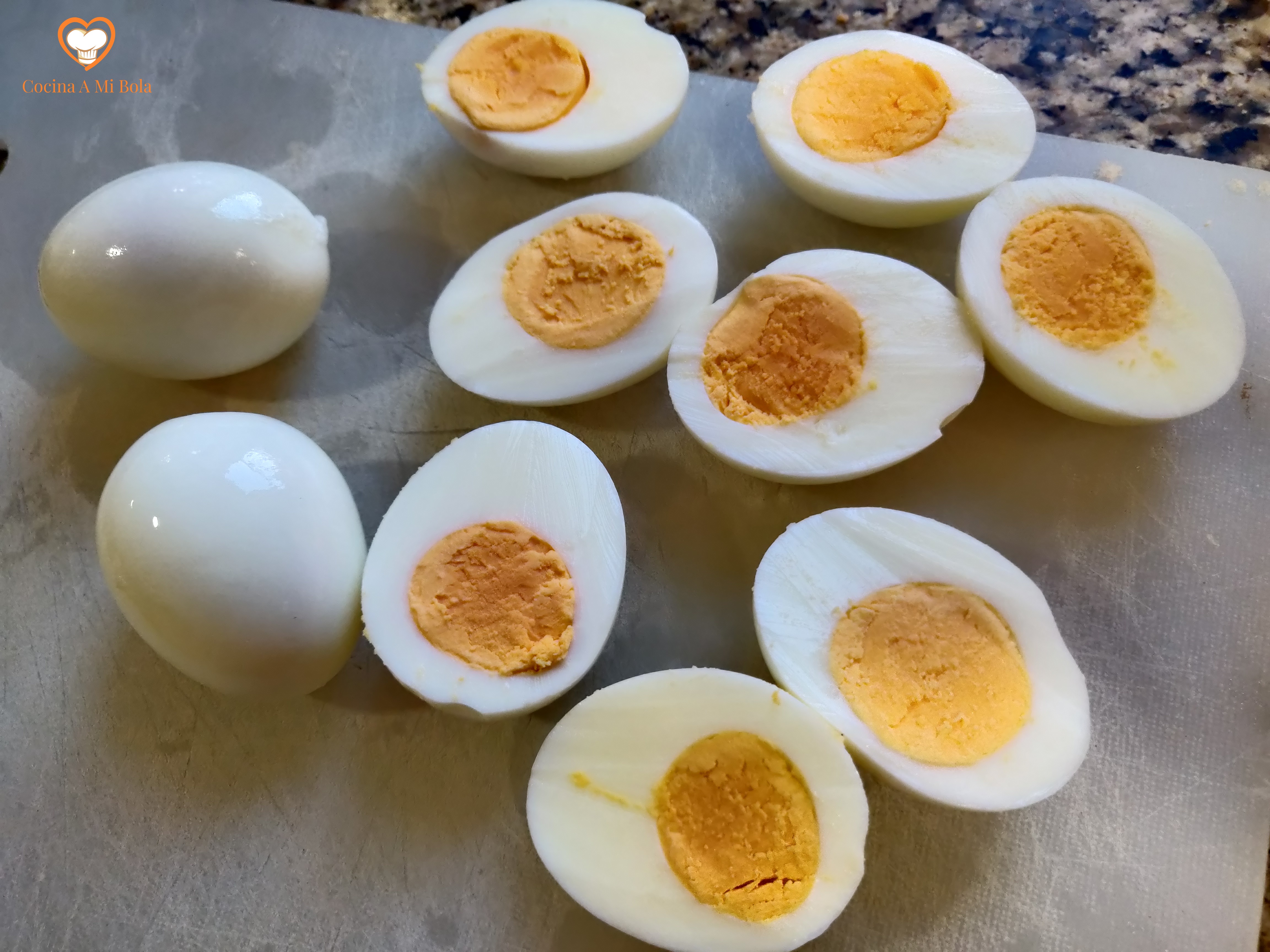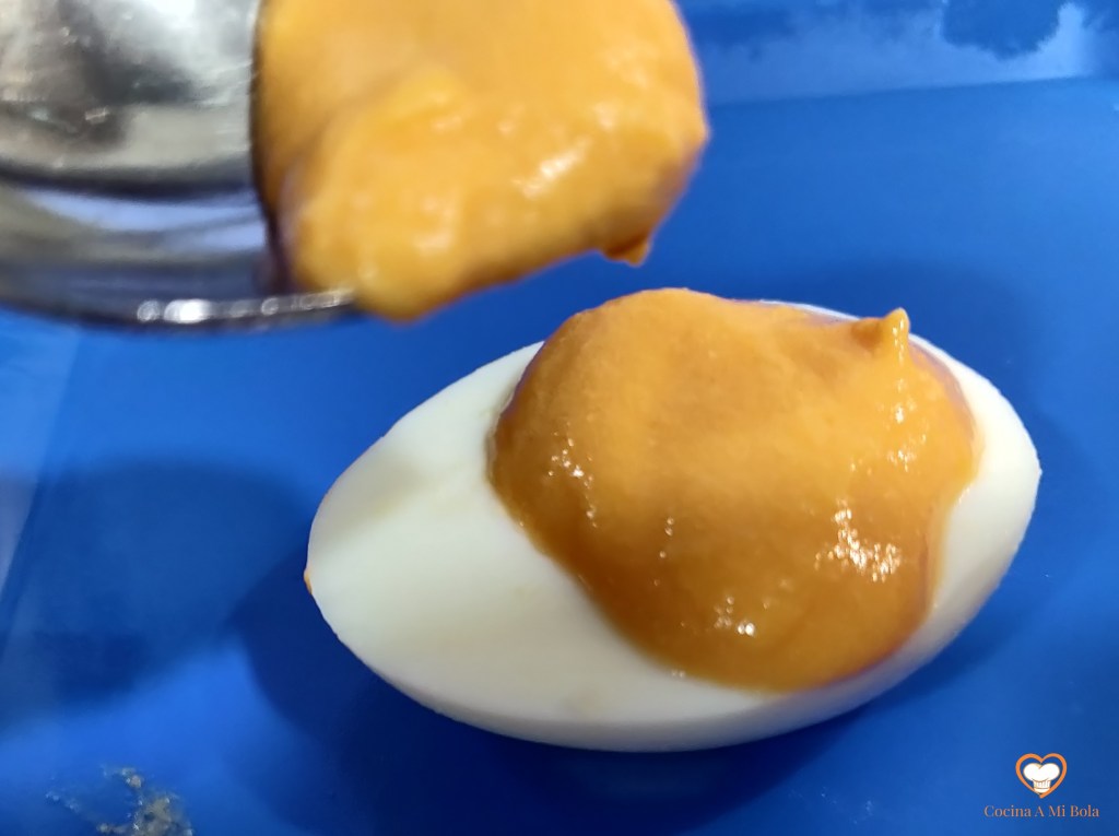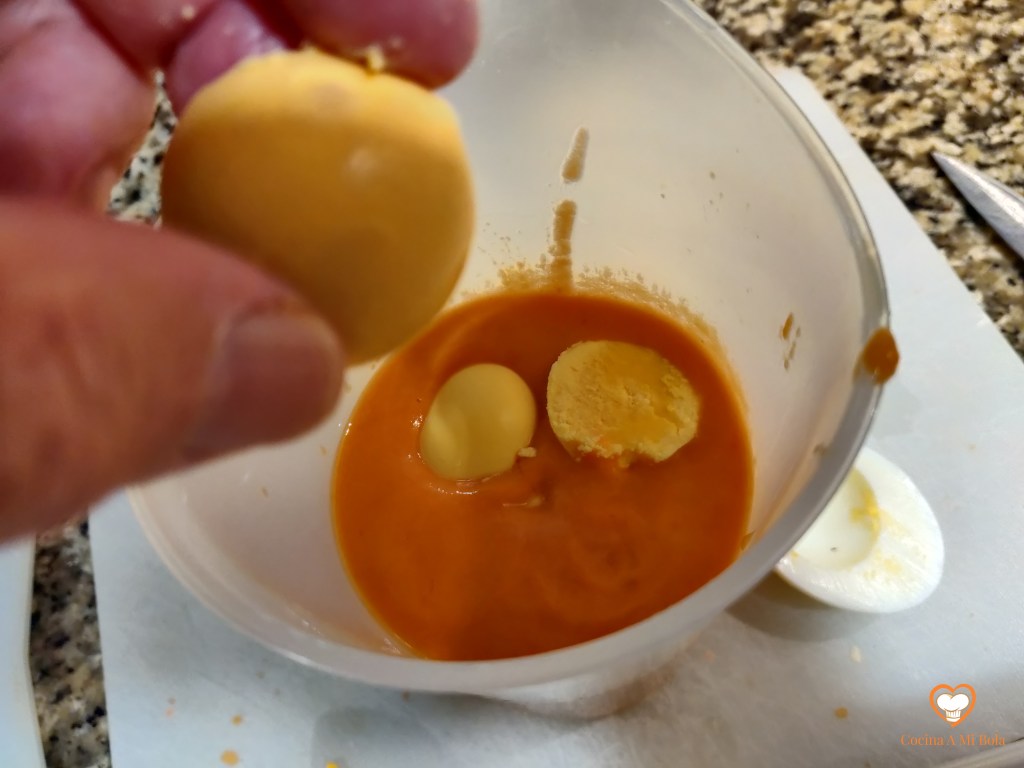TERCERO.- Córtalos por su mitad longitudinal y extrae las yemas con cuidado de no romper las medias claras, ya que van a ser el recipiente del salmorejo.