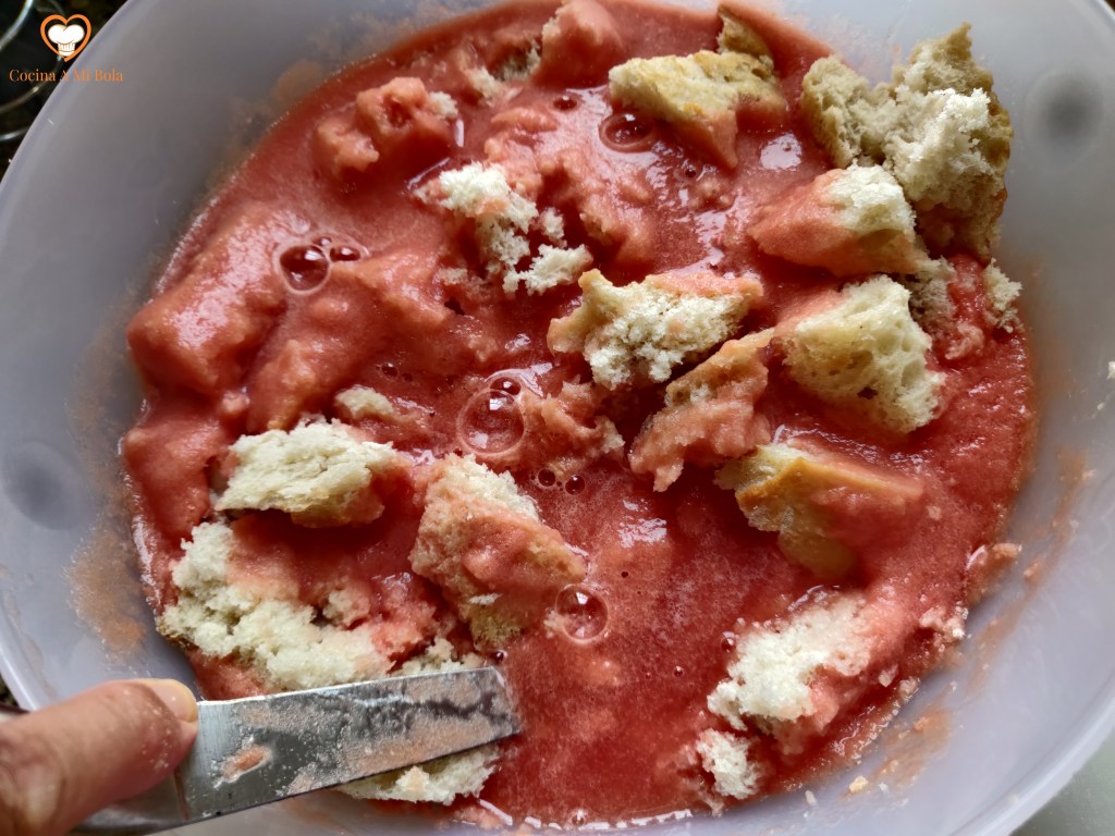 PRIMERO.- Para hacer el salmorejo, puedes seguir con más detalle la receta haciendo click aquí. Pero su elaboración es tan sencilla que no merece mucha explicación. Basta con triturar los tomates y desmigar el pan sobre ellos dejando que empape bien. Aliña con el resto de ingredientes y tritura a conciencia. La clave del éxito está en unos tomates maduros de calidad y en las proporciones.