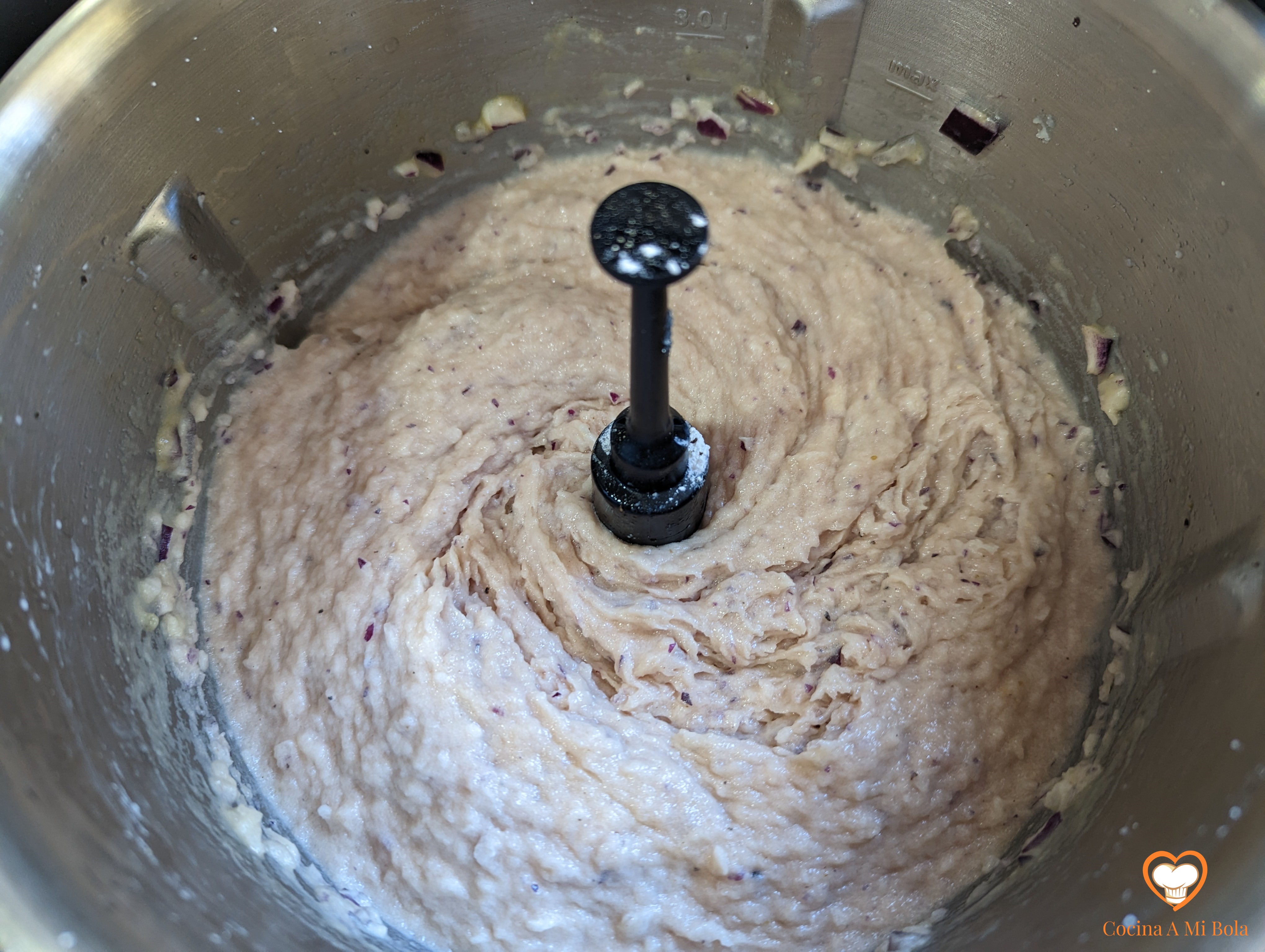 CUARTO.- Reserva dos medias yemas para decorar, y el resto, las echamos al vaso batidor del robot junto con el salmorejo. Batimos bien para que se trituren y hagan cuerpo con éste, y quedando bastante más espeso. Prueba de sal porque las yemas van a bajar la concentración y tal vez debas añadir un poco. No obstante lo anterior, no olvides que vamos a complementar este plato con jamón ibérico, que aportará su “umami”.