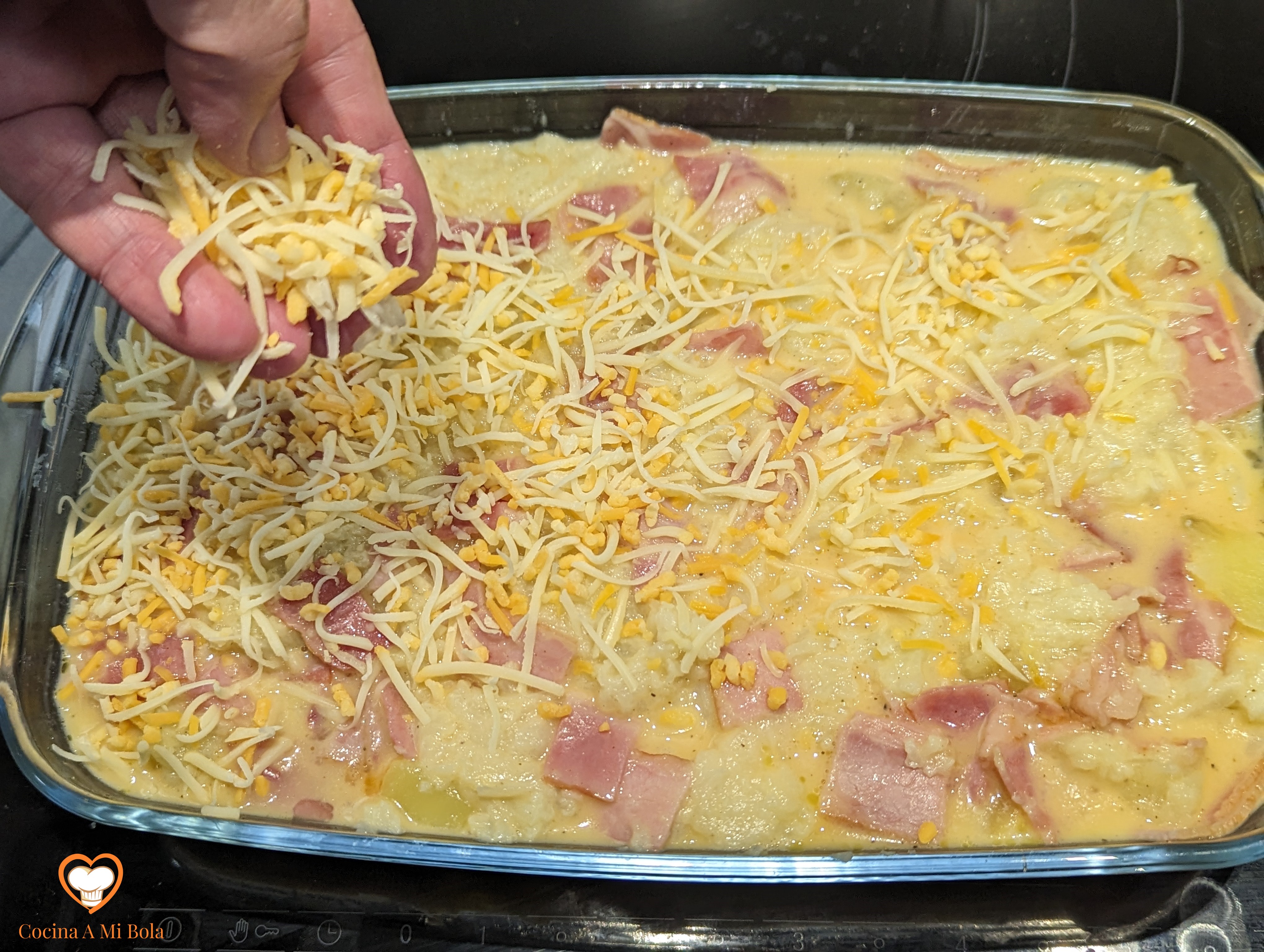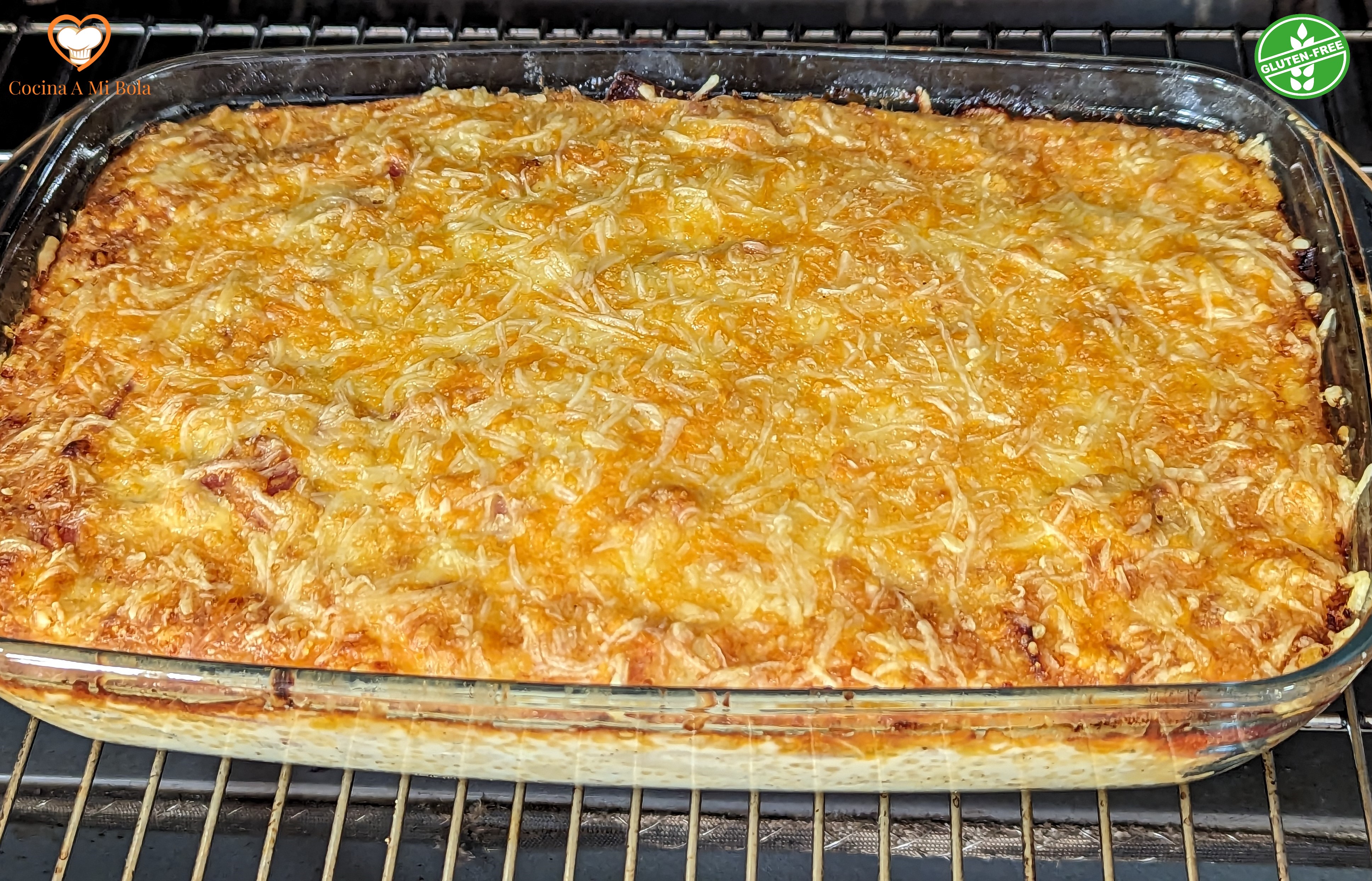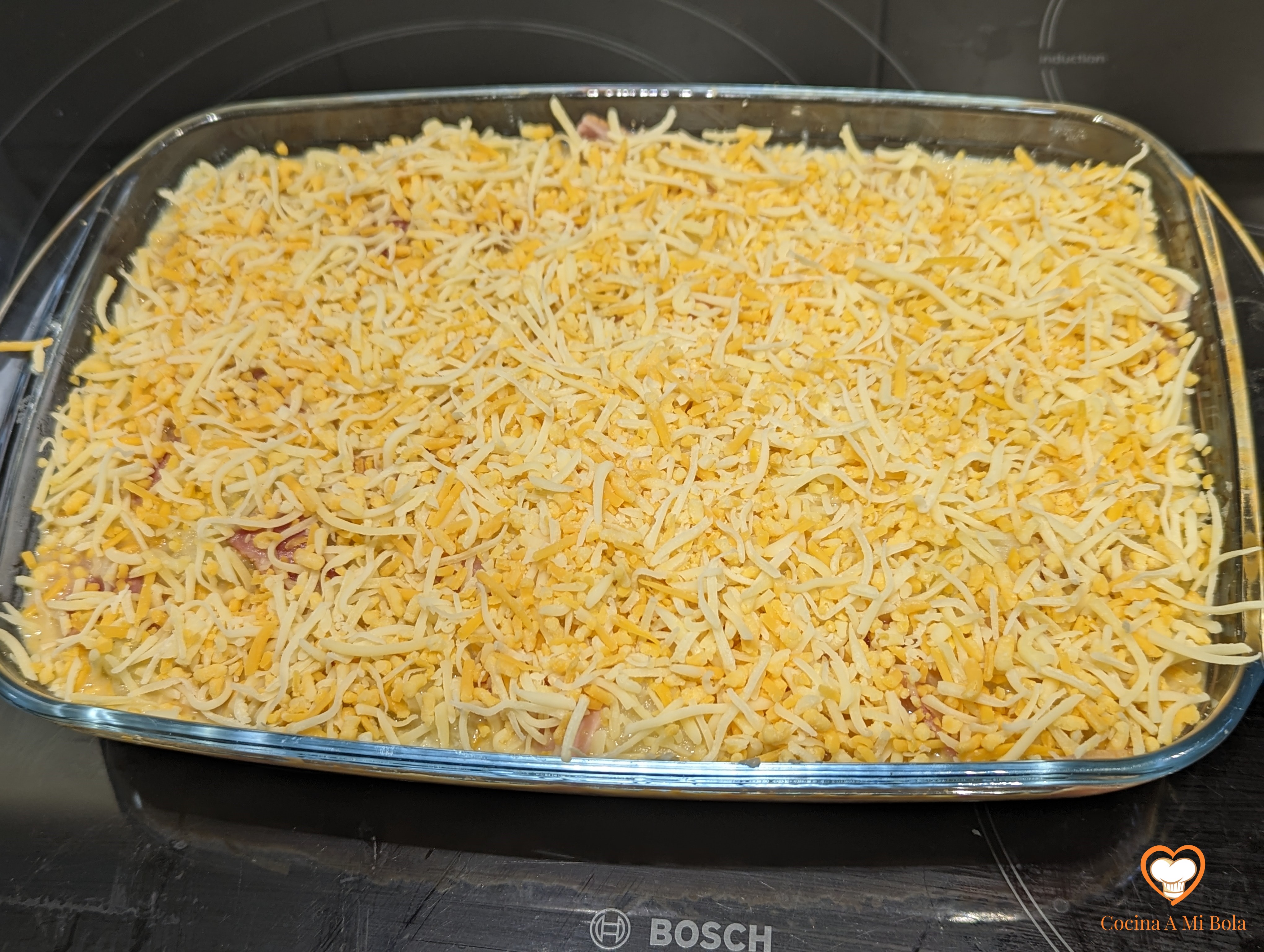 SEPTIMO.-  Cubre la superficie con ambas clases de queso previamente mezcladas y mételo en el horno hasta que cuaje. Cada horno tiene sus tiempos, así que no daré referencias al respecto. La idea es que se haga despacio y cuando el queso esté dorado, estará listo.