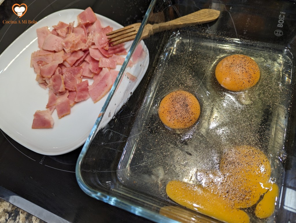 SEGUNDO.- En una fuente rectangular apta para horno, echa los huevos, salpimenta y bátelos.