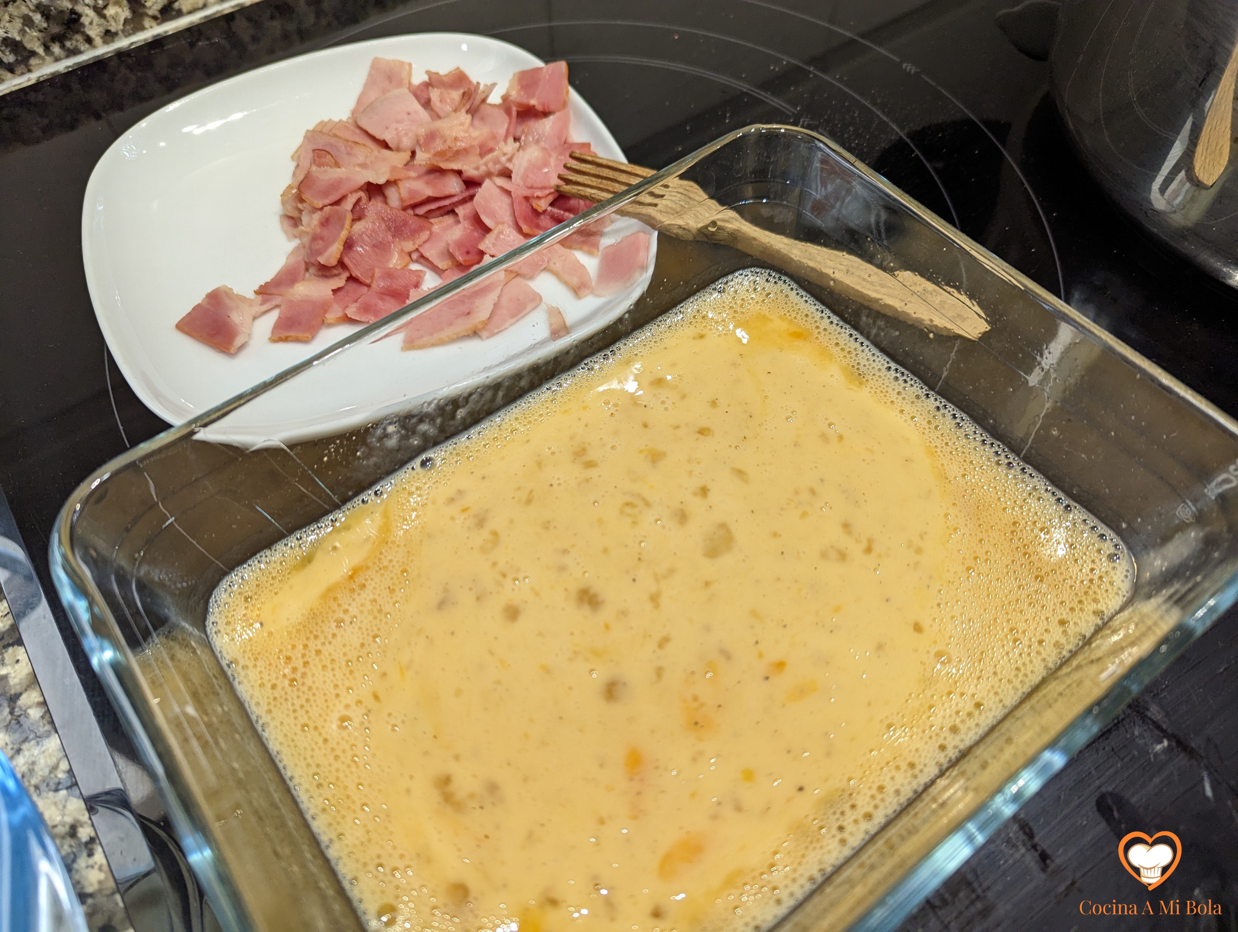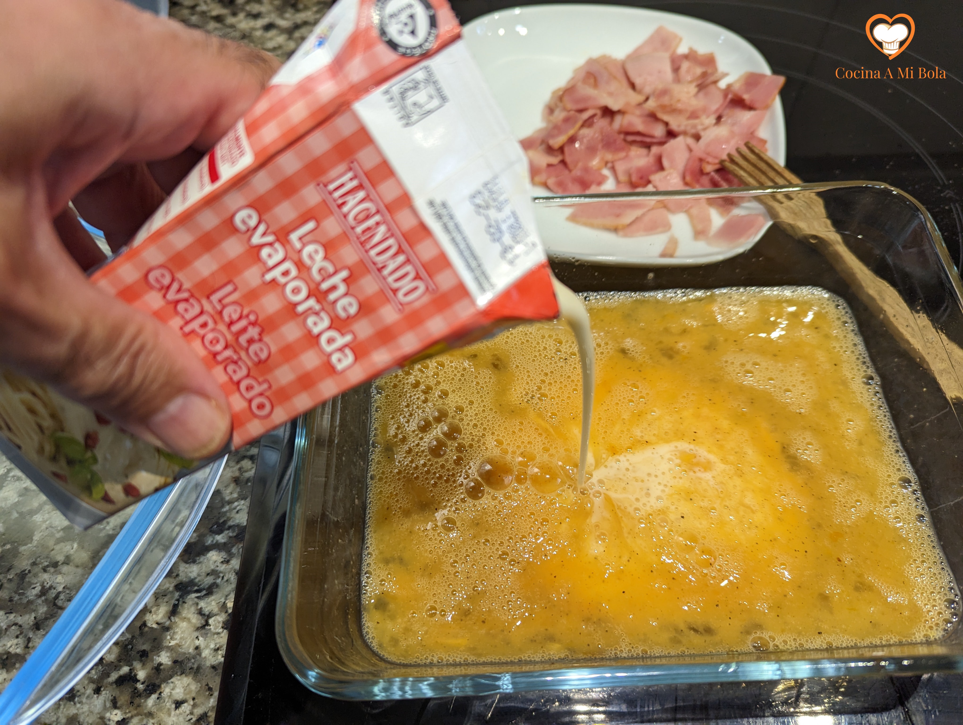 SEXTO.-  Ahora se trata de ir vertiendo poco a poco los huevos batidos con la leche evaporada por toda la superficie de la fuente ahuecando con un tenedor para que penetre hasta el fondo.