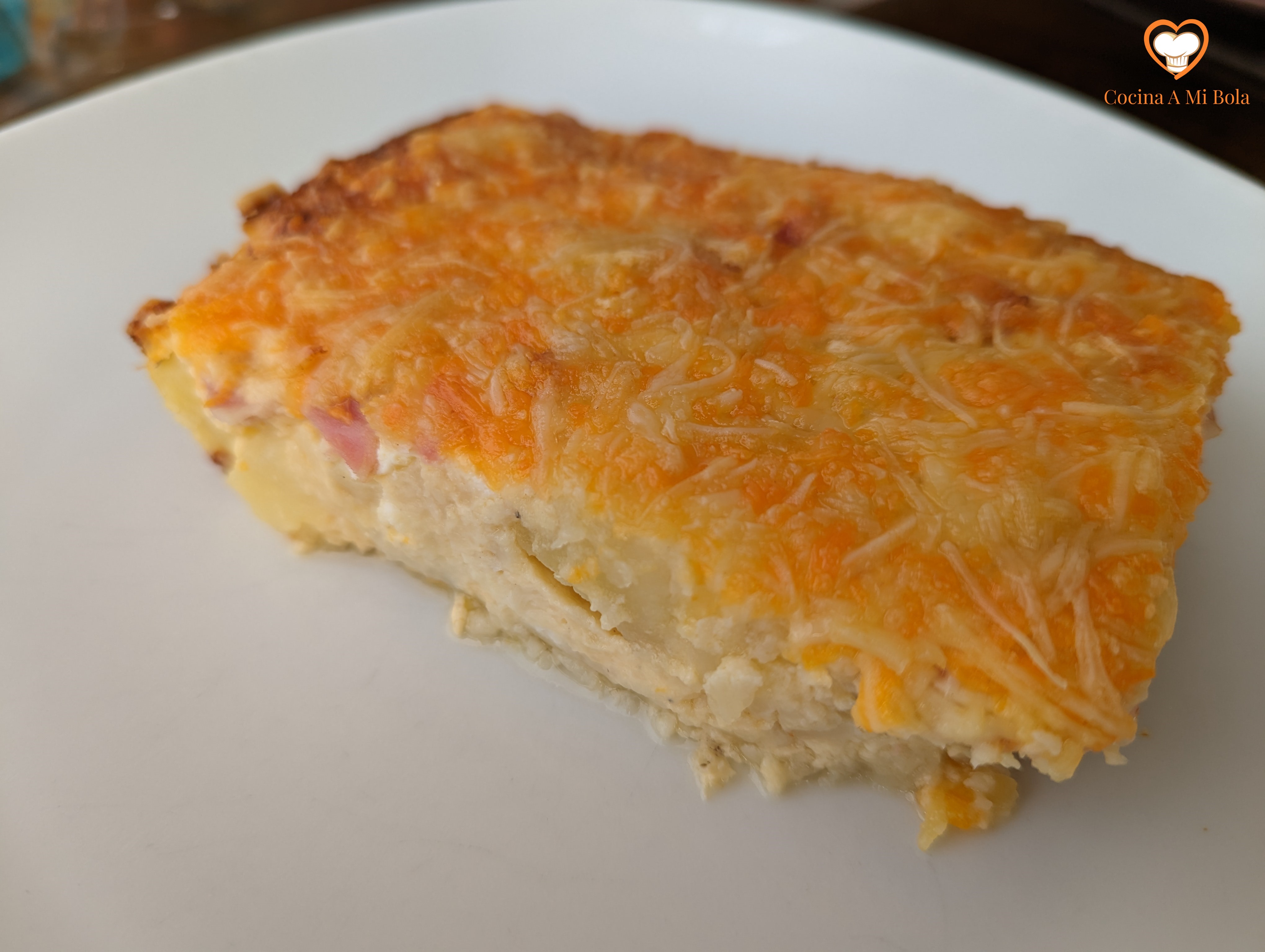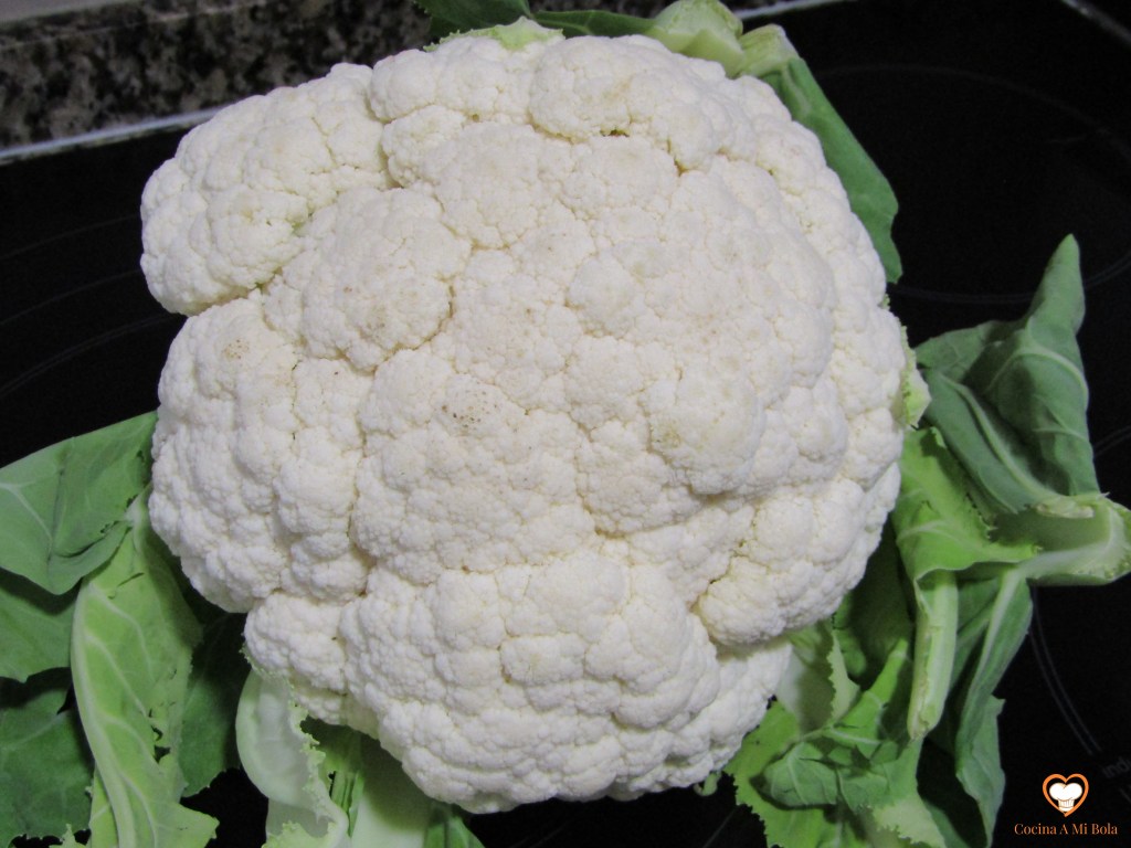 INGREDIENTES para 4/5 personas: 1 coliflor de 800 grs a 1 kg., 1 patata grande, 3 huevos, 100 grs bacon ahumado en lonchas, 200 cc leche evaporada, 100 grs mozzarella rallada, 100 grs queso Cheddar rallado, pimienta negra molida y sal.