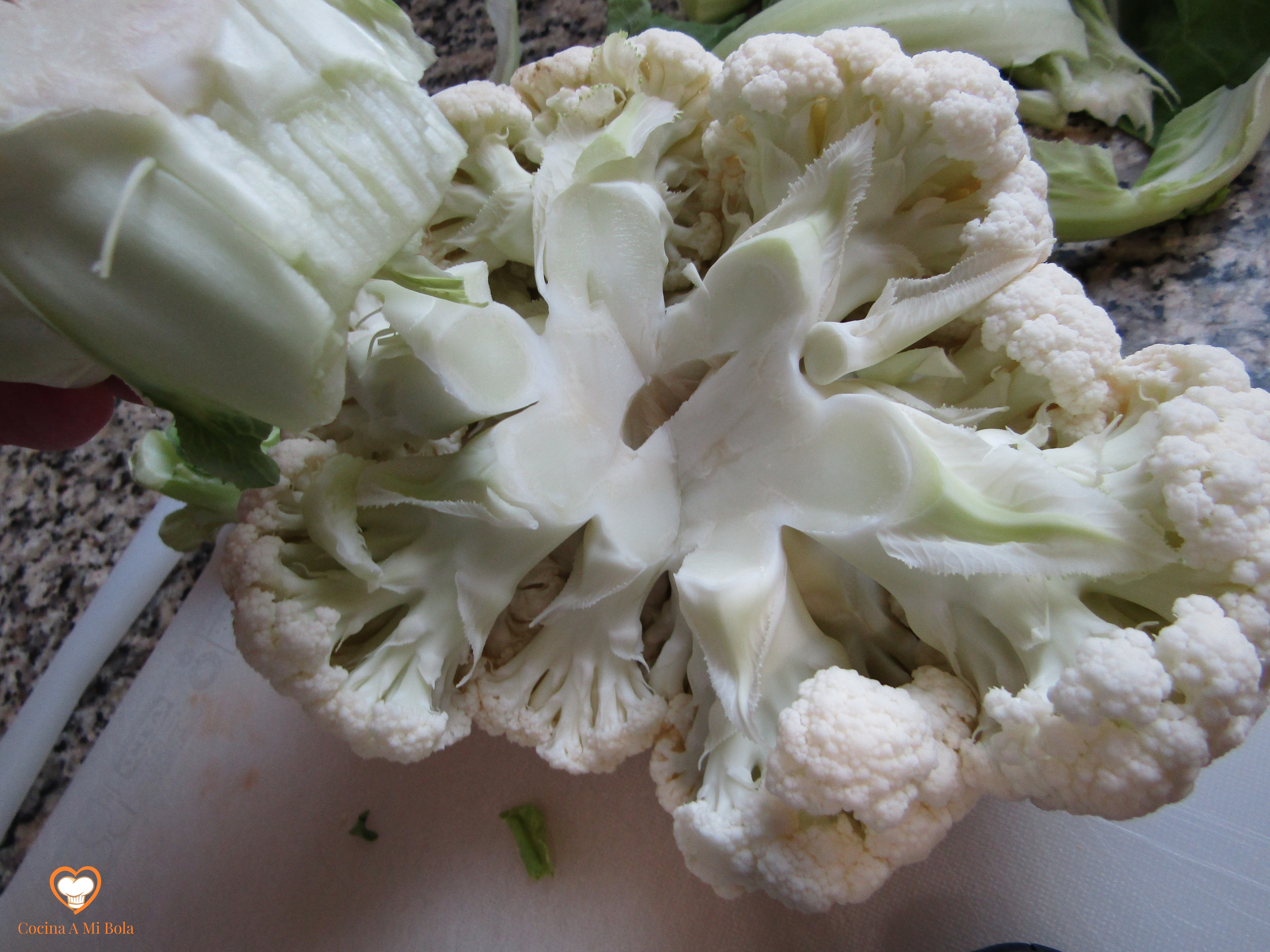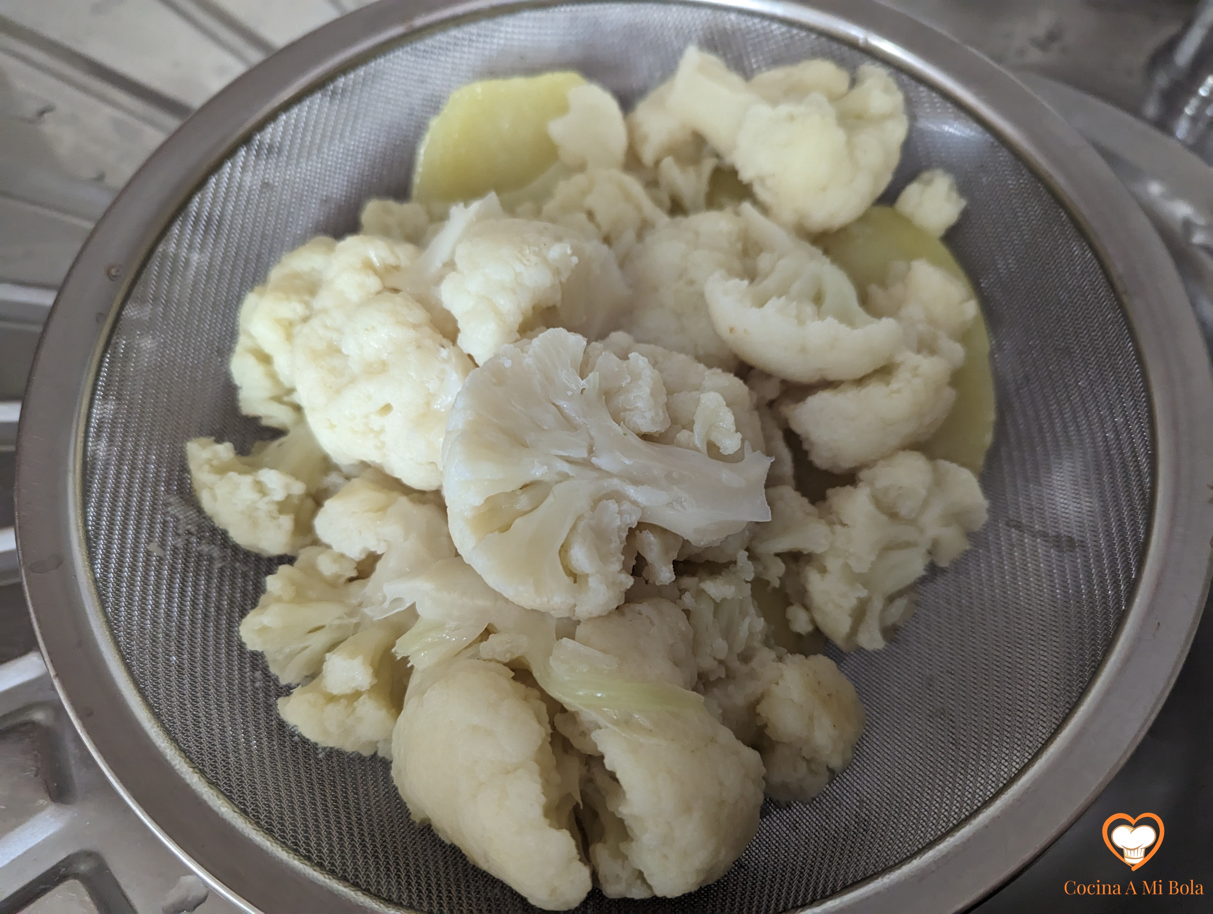 PRIMERO.-  Elimina las hojas verdes de la coliflor, corta y desecha la parte más leñosa del tronco y hazla arbolitos. Pela la patata y trocéala. Cuécelas en la olla express rápida con un poco de sal durante 4 minutos, abre, escurre y reserva.