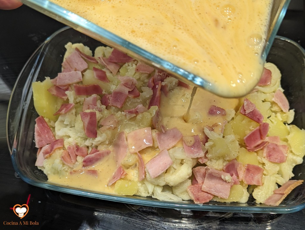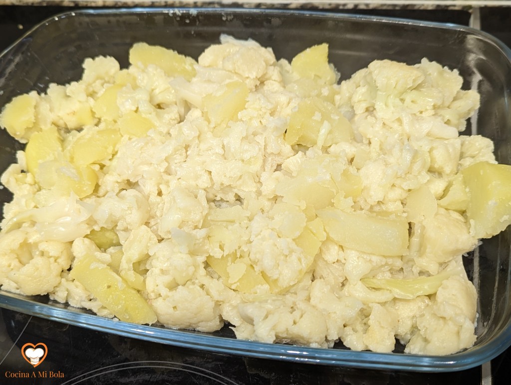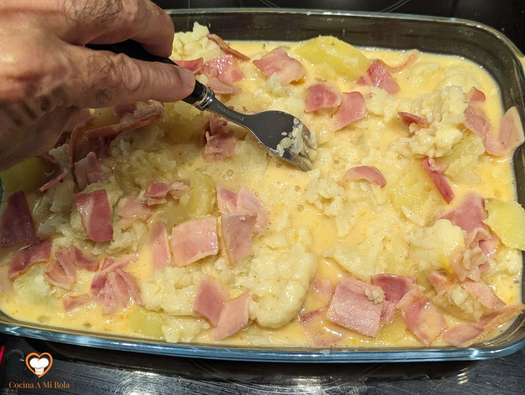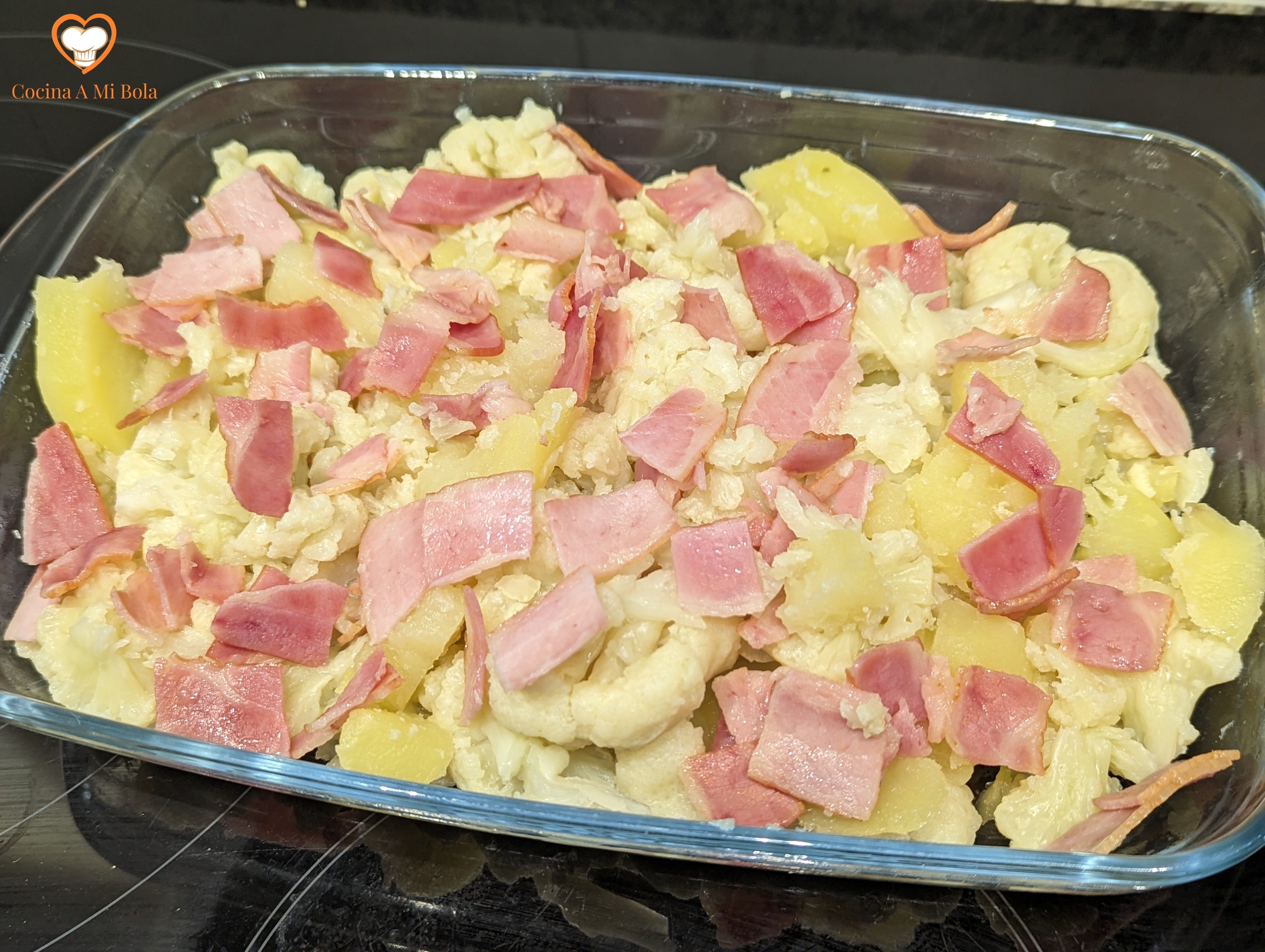 QUINTO.- Mezcla la coliflor con la patata con muchísimo mimo para que no se deshaga ni una ni otra. Añade el bacon y procura repartir los tres ingredientes de un modo homogéneo por toda la fuente. Enciende el horno y prográmalo con ventilación, calor arriba y abajo y 170ºC