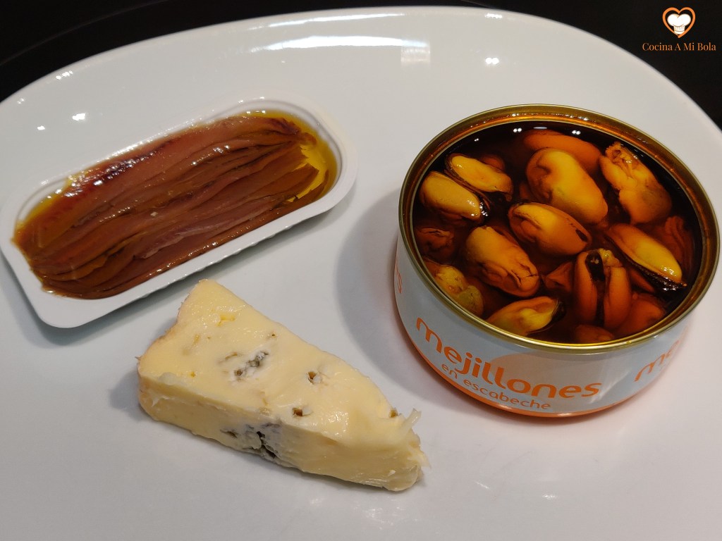 INGREDIENTES: Una lata de 100grs de mejillones en escabeche, una lata 40grs de anchoas en aceite de oliva, 100 grs queso Gorgonzola dulce.