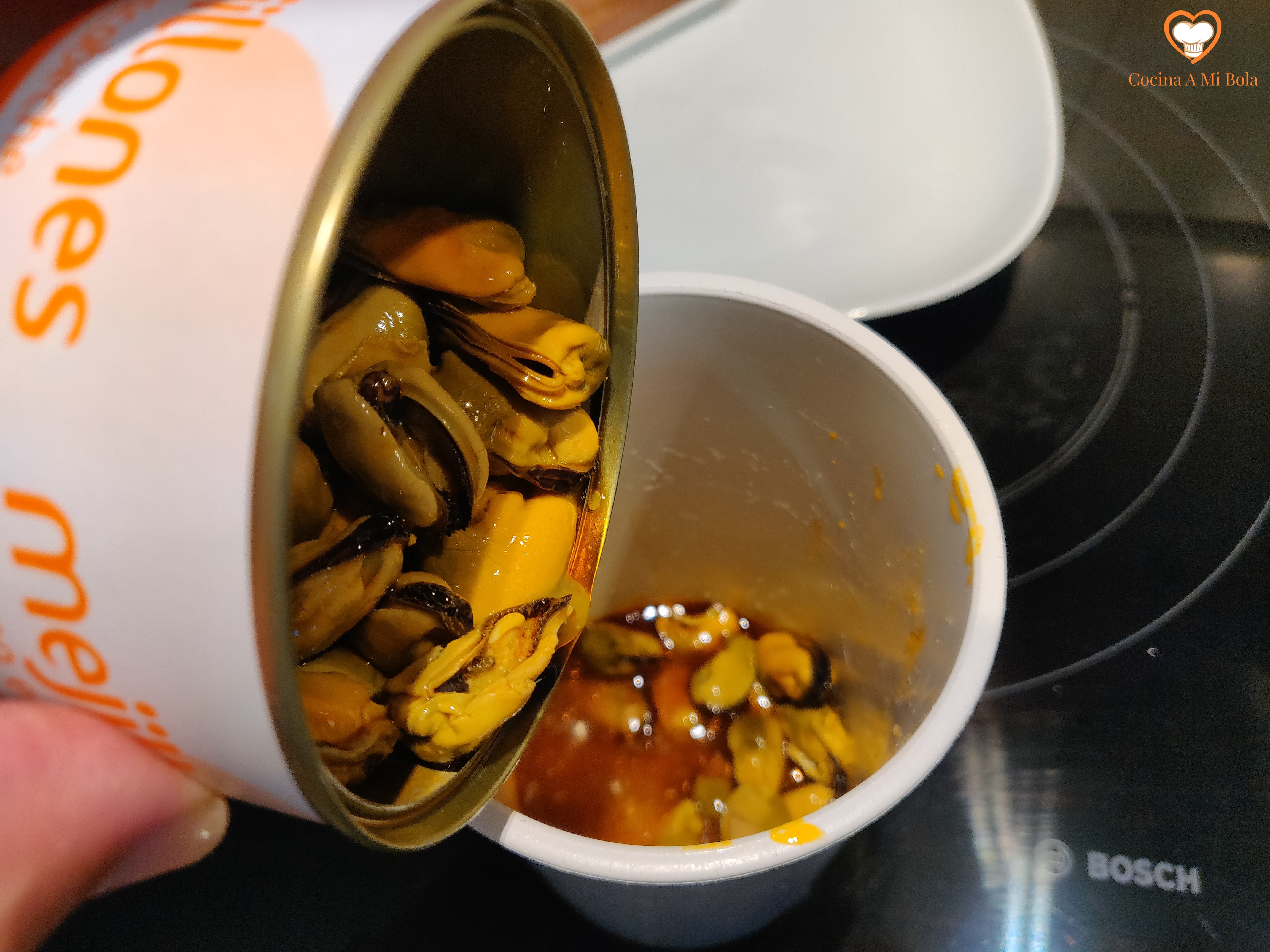 SEGUNDO.- Abre la lata de mejillones y revísala antes por si hubiera algún trocito de hoja de laurel o de concha de mejillón y elimínalo. Echa los mejillones en el vaso con todo su escabeche y bate a conciencia.
