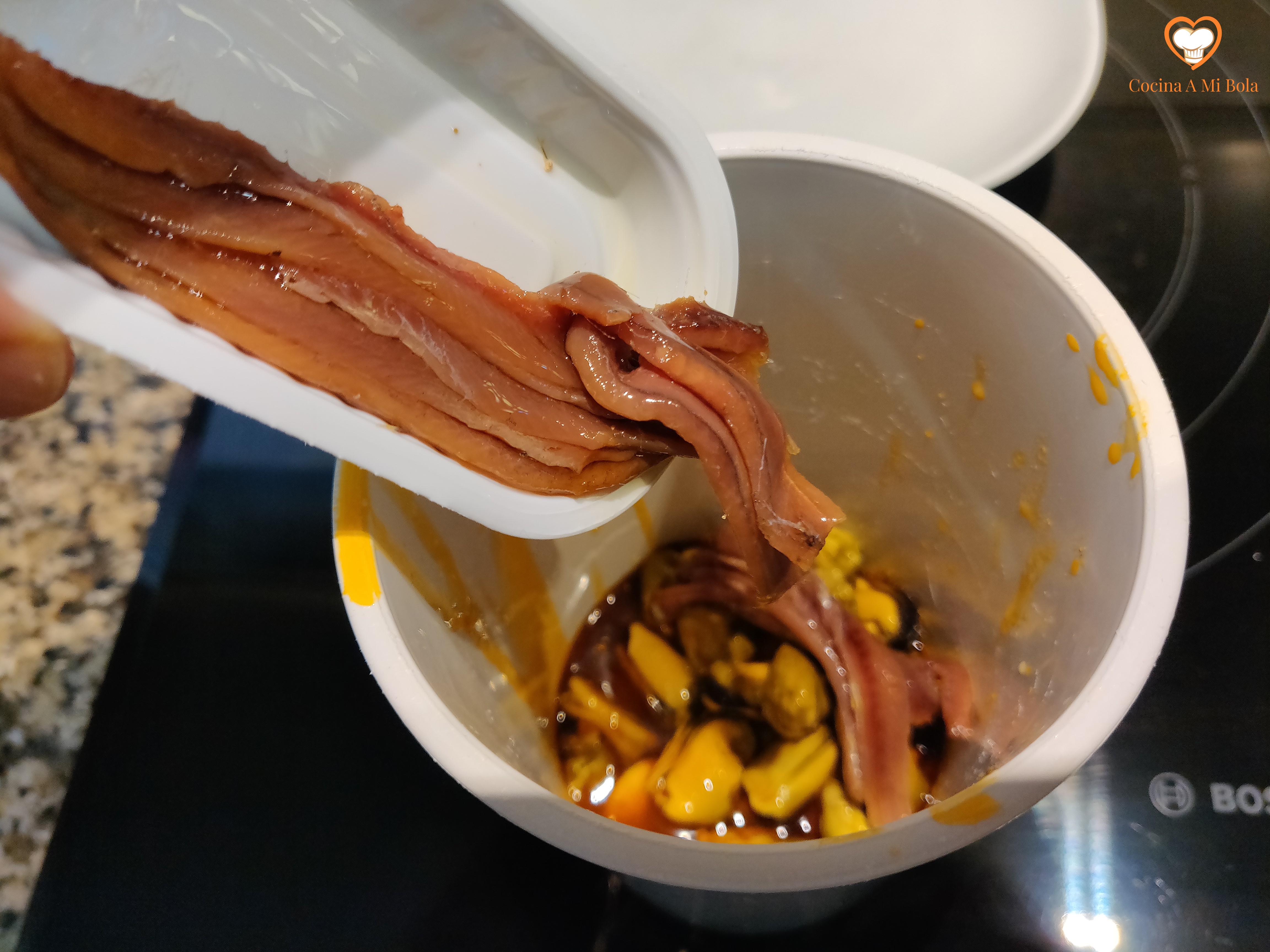 TERCERO.- Ahora agrega las anchoas con su aceite y bátelo también. Si la anchoa ya está atemperada, puedes batir ambos ingredientes a la vez.