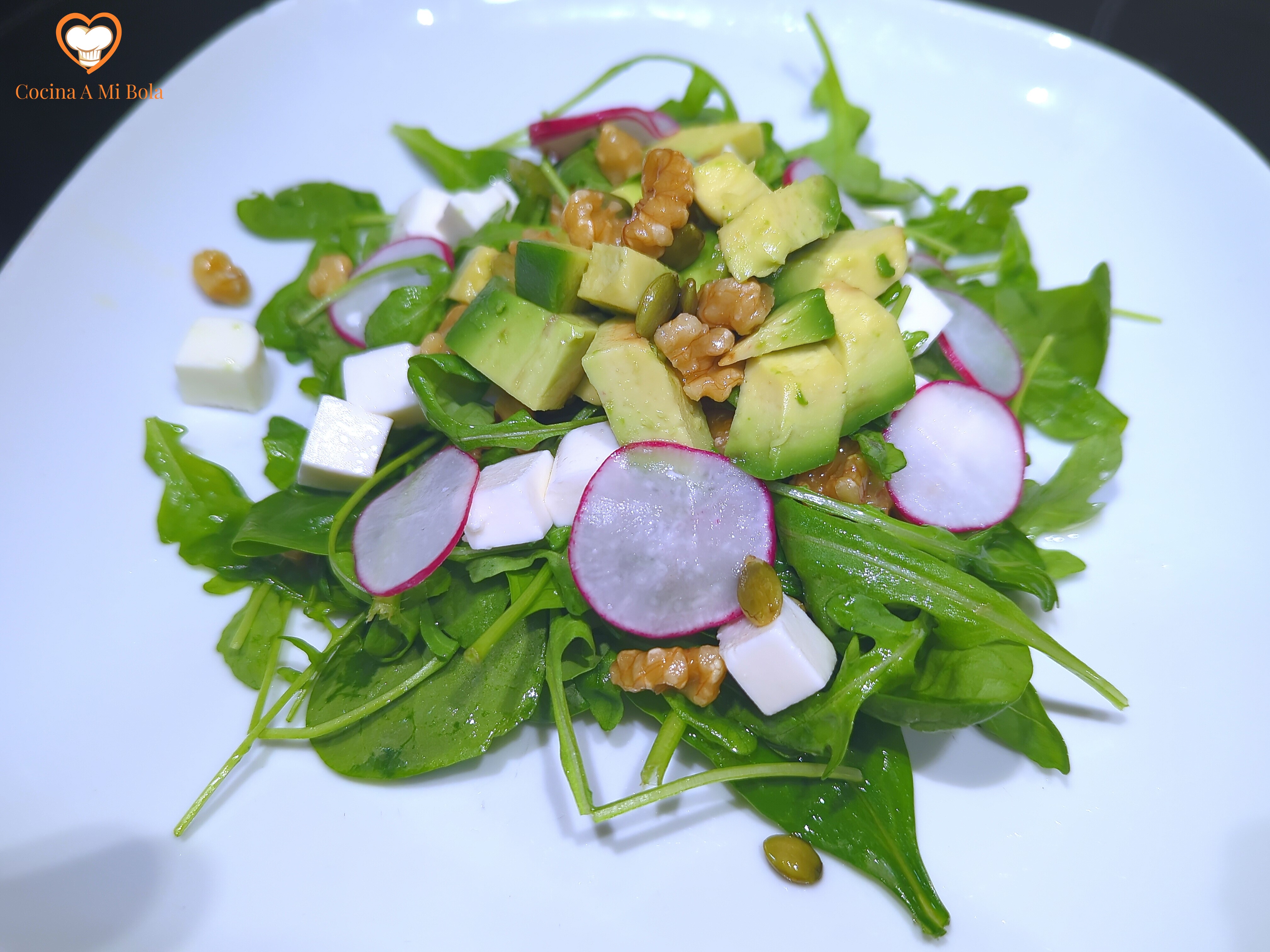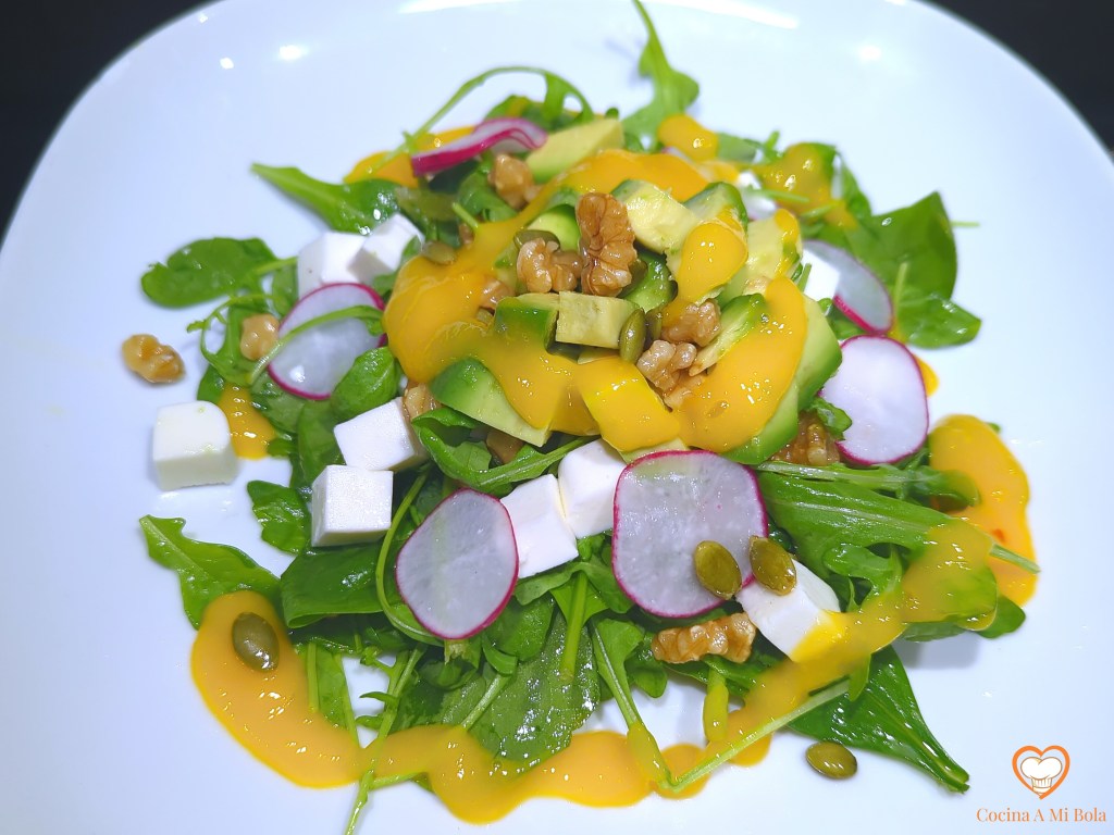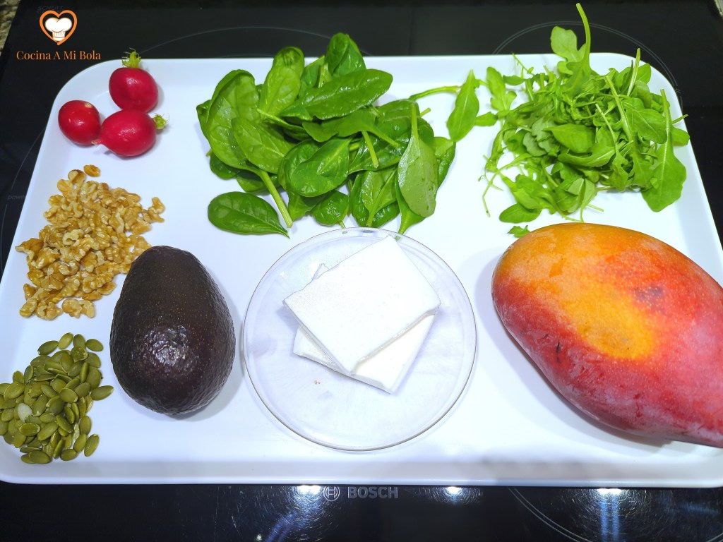 INGREDIENTES: Para 4 personas: 1 mango maduro de 350 gr aprox, 100 gr queso blanco con sal (tipo Burgos), 100 gr espinacas baby frescas, 100 gr rúcula fresca, 4 rabanitos, 1 aguacate maduro grande o 2 pequeños, 15 gr de pipas de calabaza, 25 gr de nueces troceadas, 2 cucharadas de aceite de sésamo y sal.