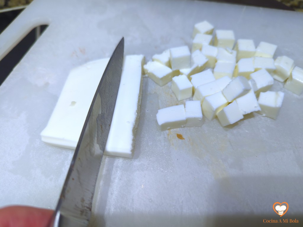 SEGUNDO.- Corta el queso fresco en cuadraditos y si no es “con sal”, pon un poco por encima para que realce su sabor y agrégalo a la ensaladera.