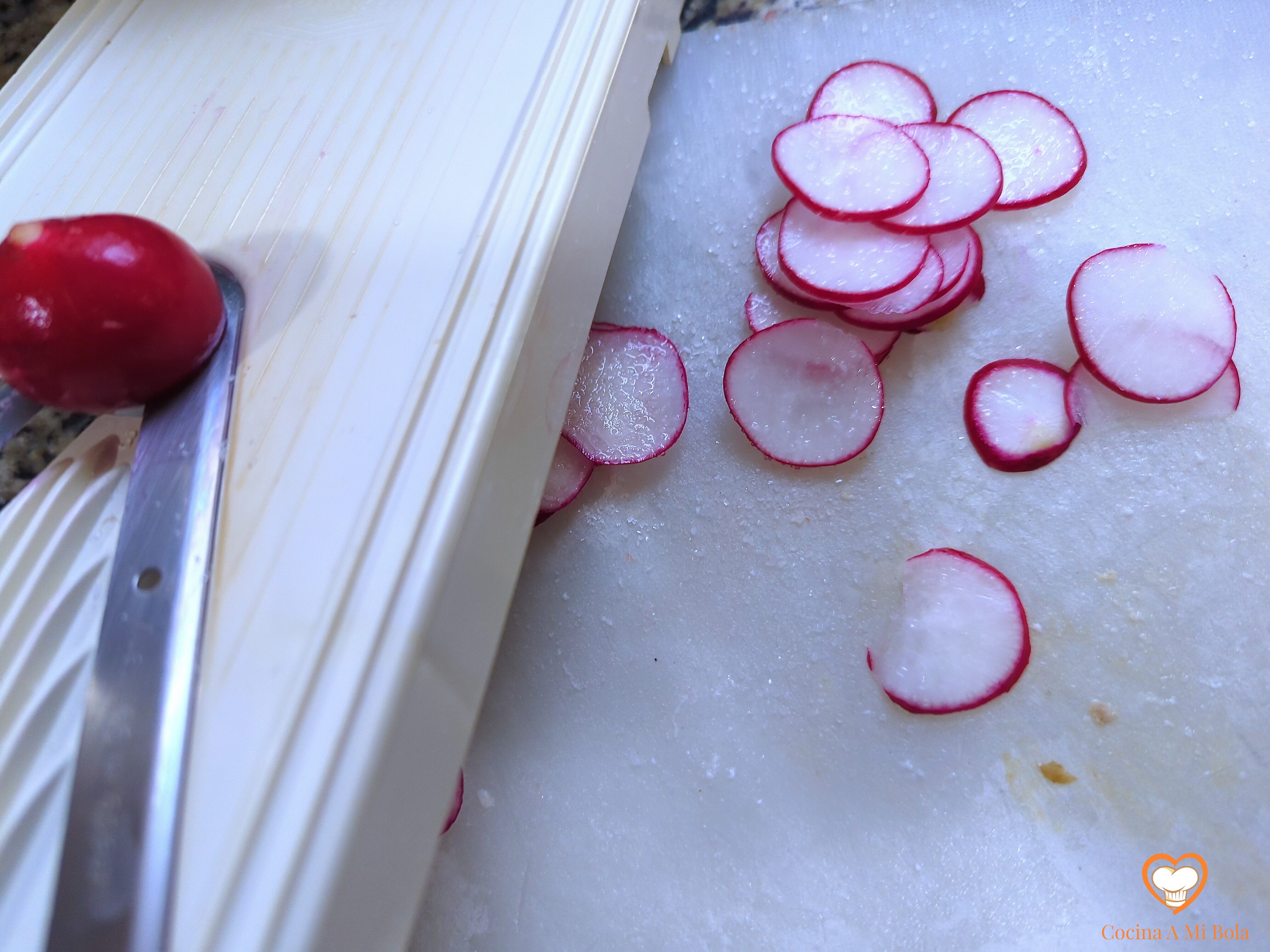 TERCERO.- Lava los rabanitos, corta las hojas y usa el accesorio de corte más fino de la mandolina para cortarlos en láminas que extenderás sobre la encimera o la tabla y les pondrás sal. A continuación, incorpóralas a la ensaladera procurando repartirlas por toda su superficie, ya que tenderán a adherirse unas a otras.