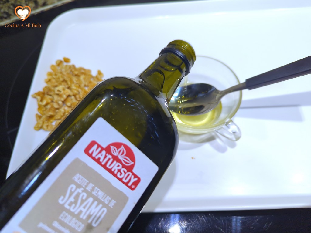 CUARTO.- Pon dos cucharadas de aceite de sésamo en una taza, echa las pipas y las nueces troceadas, mezclando todo para que queden bien embadurnadas. Aun no lo incorpores a la ensaladera. Resérvalo momentáneamente para que no se reblandezca la espinaca.