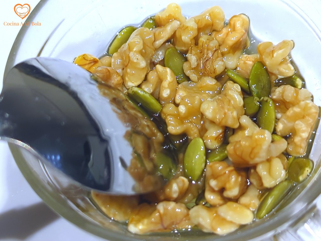 SÉPTIMO.- Es el momento de agregar las pipas y las nueces embadurnadas en el aceite de sésamo y ahora, con sumo cuidado para no maltratar los ingredientes, mézclalo todo con suavidad y con paciencia hasta que veas que todos ellos están bien distribuidos y sin apelmazarse.