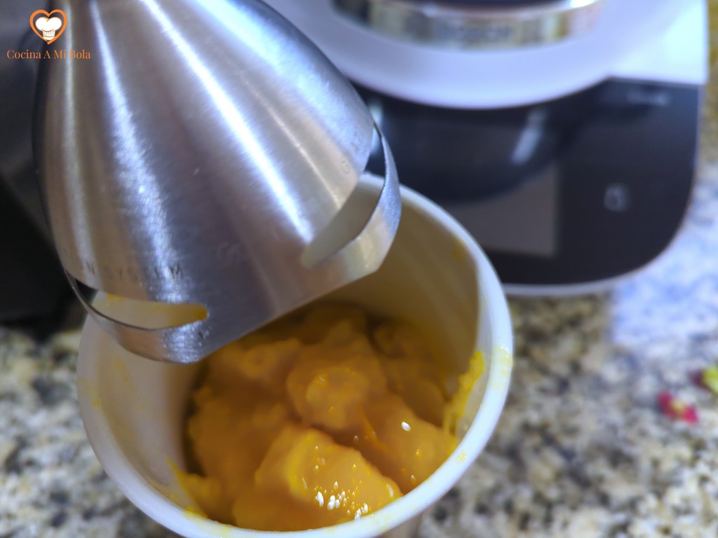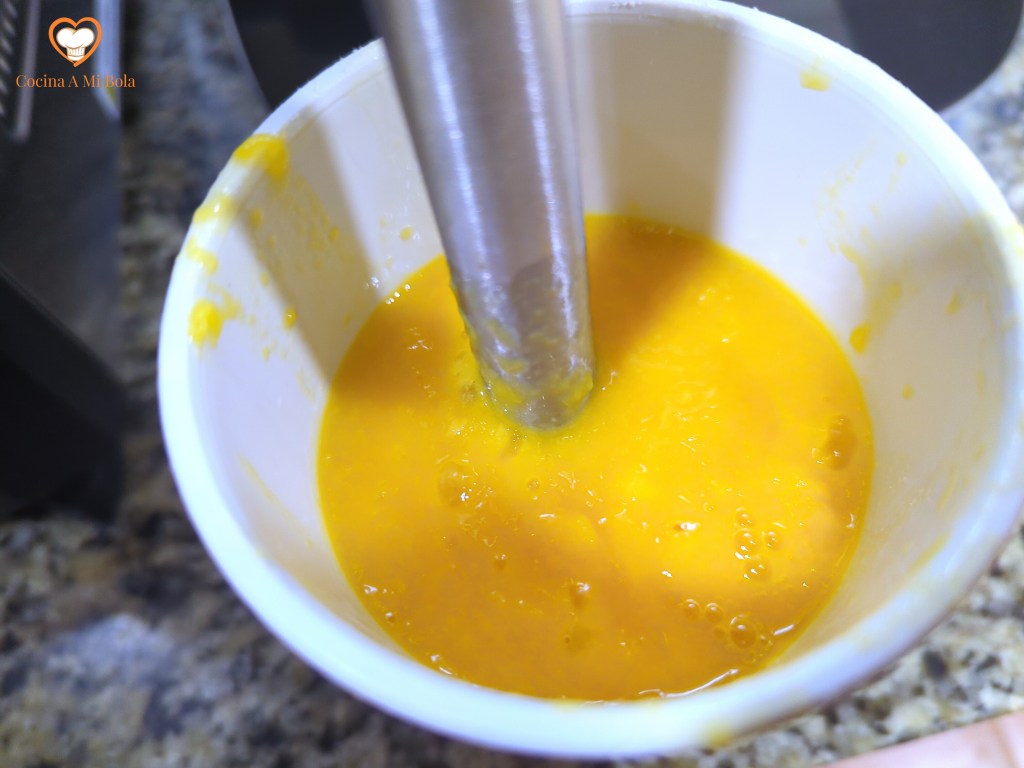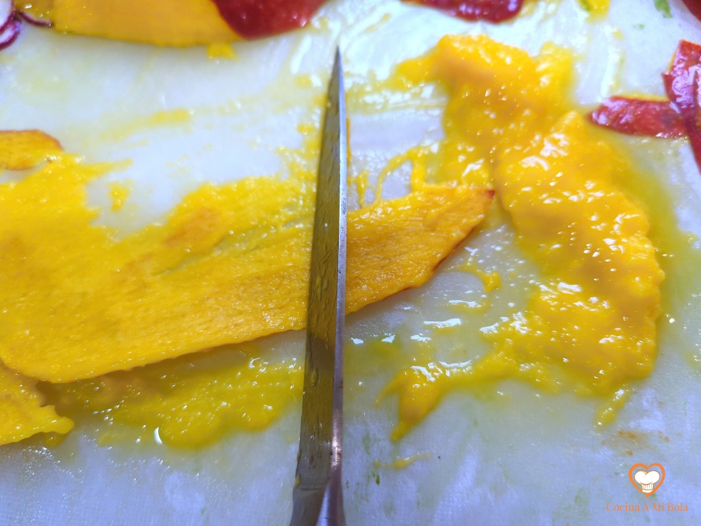 QUINTO.- Ahora es el momento del mango. Pélalo y raspa la parte interior de la piel con el filo de un cuchillo. Procura hacer lo mismo con el hueso para arrancar la mayor cantidad de pulpa posible (sin poner en peligro tu integridad…). Trocea y bátelo hasta que se convierta en una textura cremosa y sin grumos. Reserva.