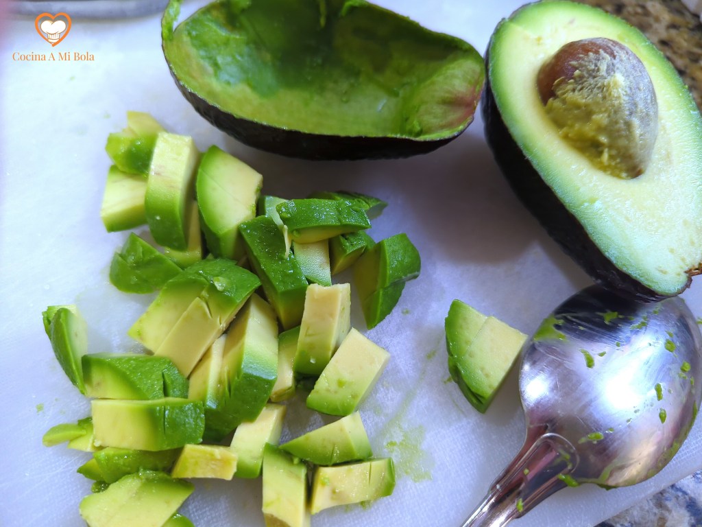 SEXTO.- Y por último, para evitar su oxidación, pela el aguacate y córtalo en cuadraditos como hemos hecho con el queso. Incorpóralo a la fuente procurando también separar bien unos trozos de otros .