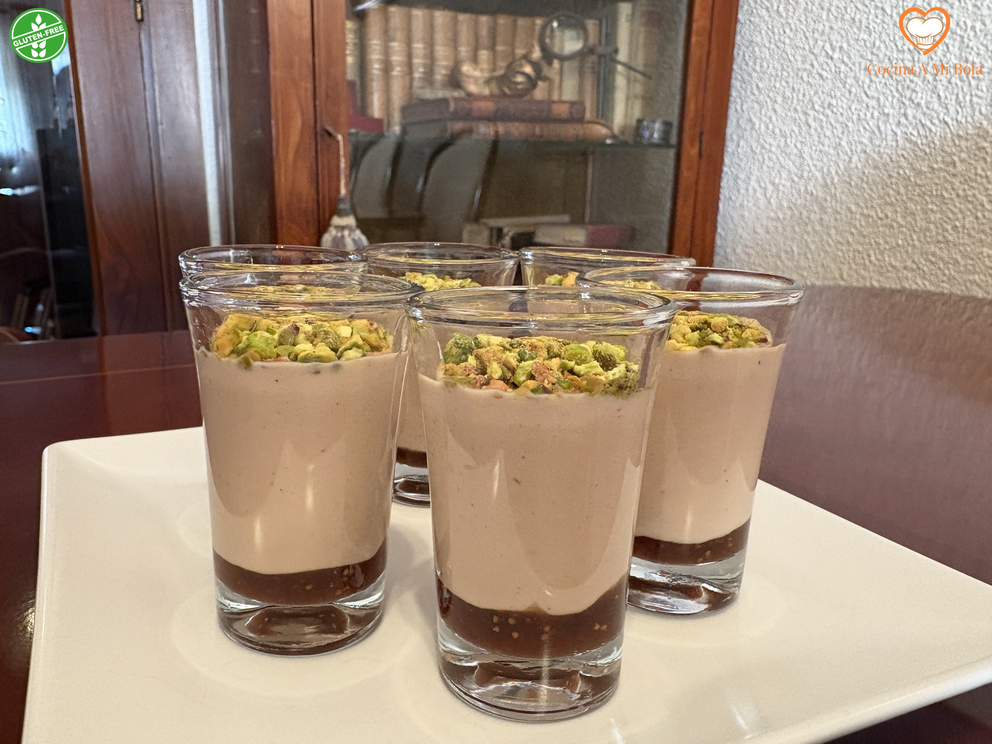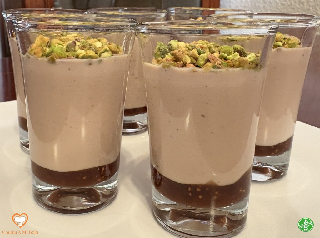 NOVENO.- Recupera los vasitos de la nevera y espolvorea sobre ellos una pequeña capa de pistacho molido. Se trata de hacer una cobertura, así que no abuses.