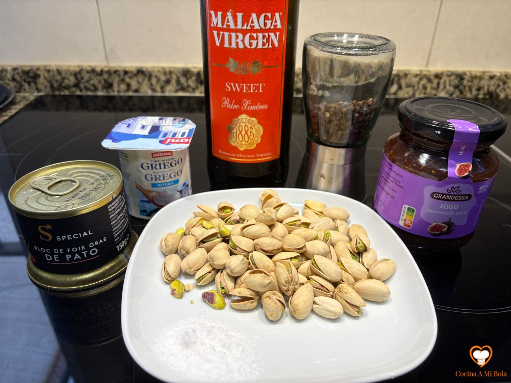 INGREDIENTES: Para 10/12 vasitos de 34 cc: 150 gr foie micuit de pato, 200 gr yogur griego natural, 4 cucharadas soperas de vino dulce Málaga Virgen, mermelada de higo, 50 gr pistachos sin cáscara, sal y pimienta negra molida.