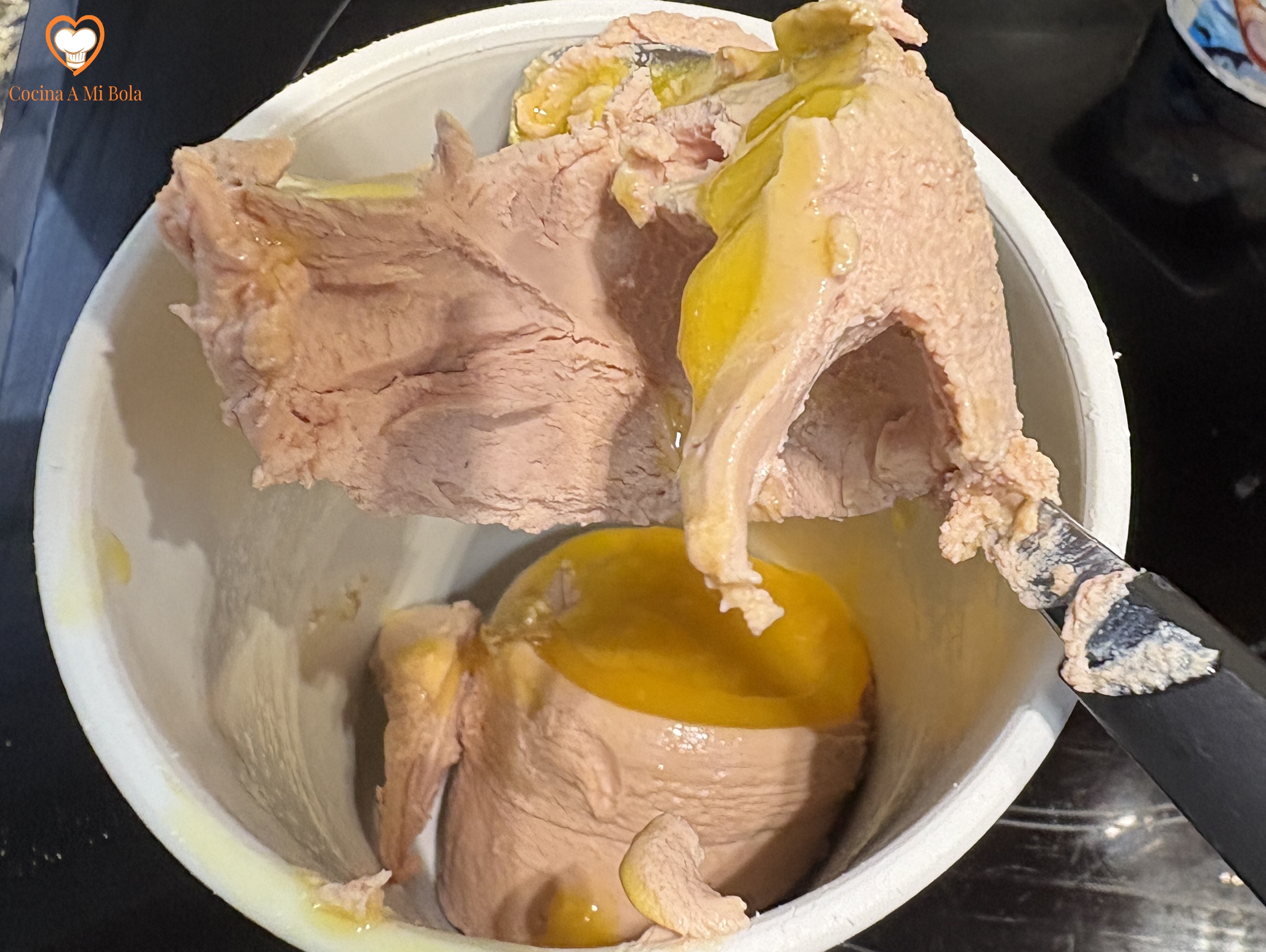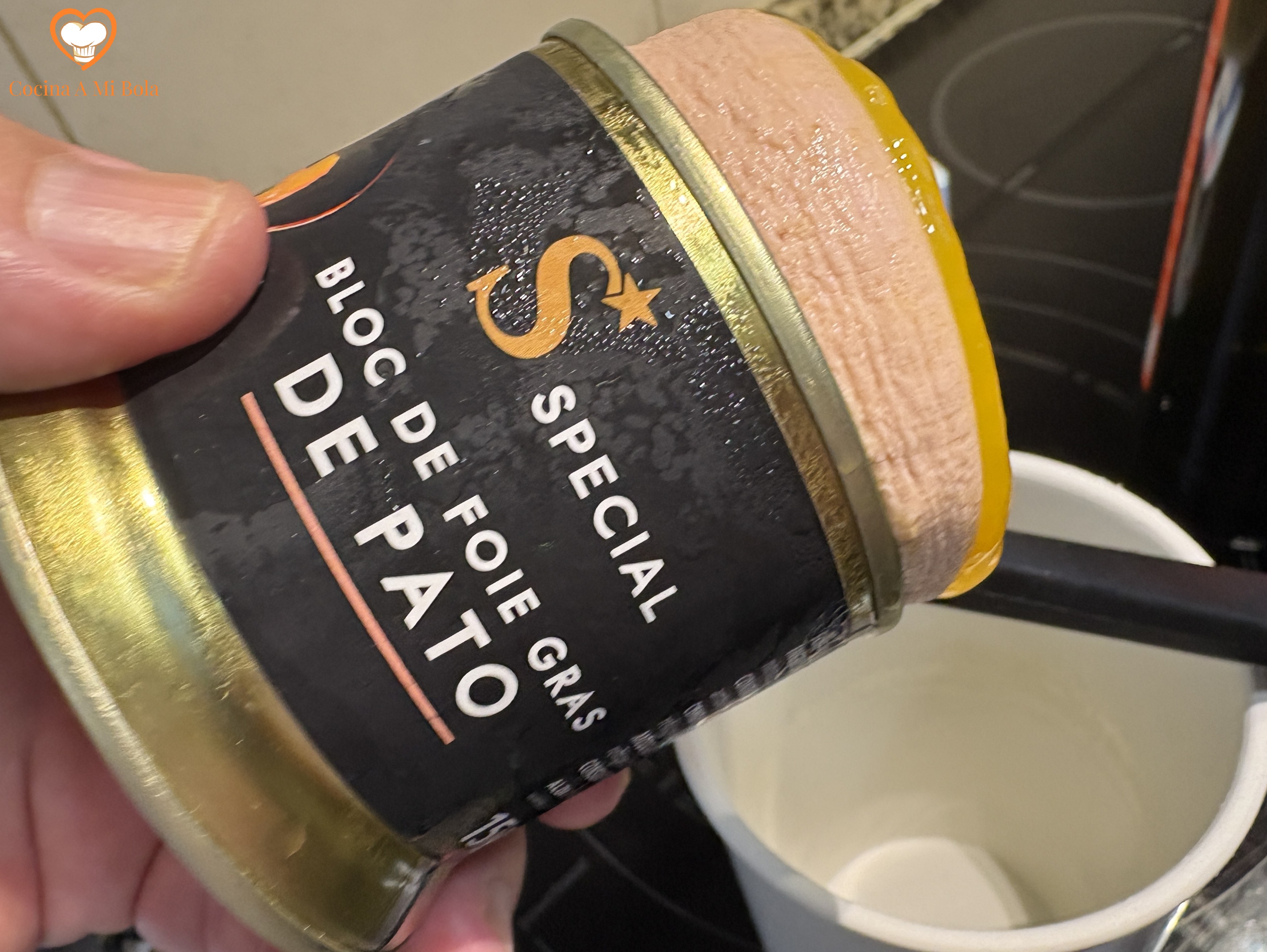 PRIMERO.- Empecemos por atemperar el foie micuit, que suele presentarse comercialmente en latas de semi-conserva, y precisan refrigeración. Si te atreves, hazlo tú mismo siguiendo mi receta Foie Micuit haciendo click aquí . Es algo laboriosa, pero el resultado es excelente. Al fin y al cabo, el término francés “micuit” significa “media cocción”, es decir, cocción a baja temperatura, y no tiene mucha más complicación.