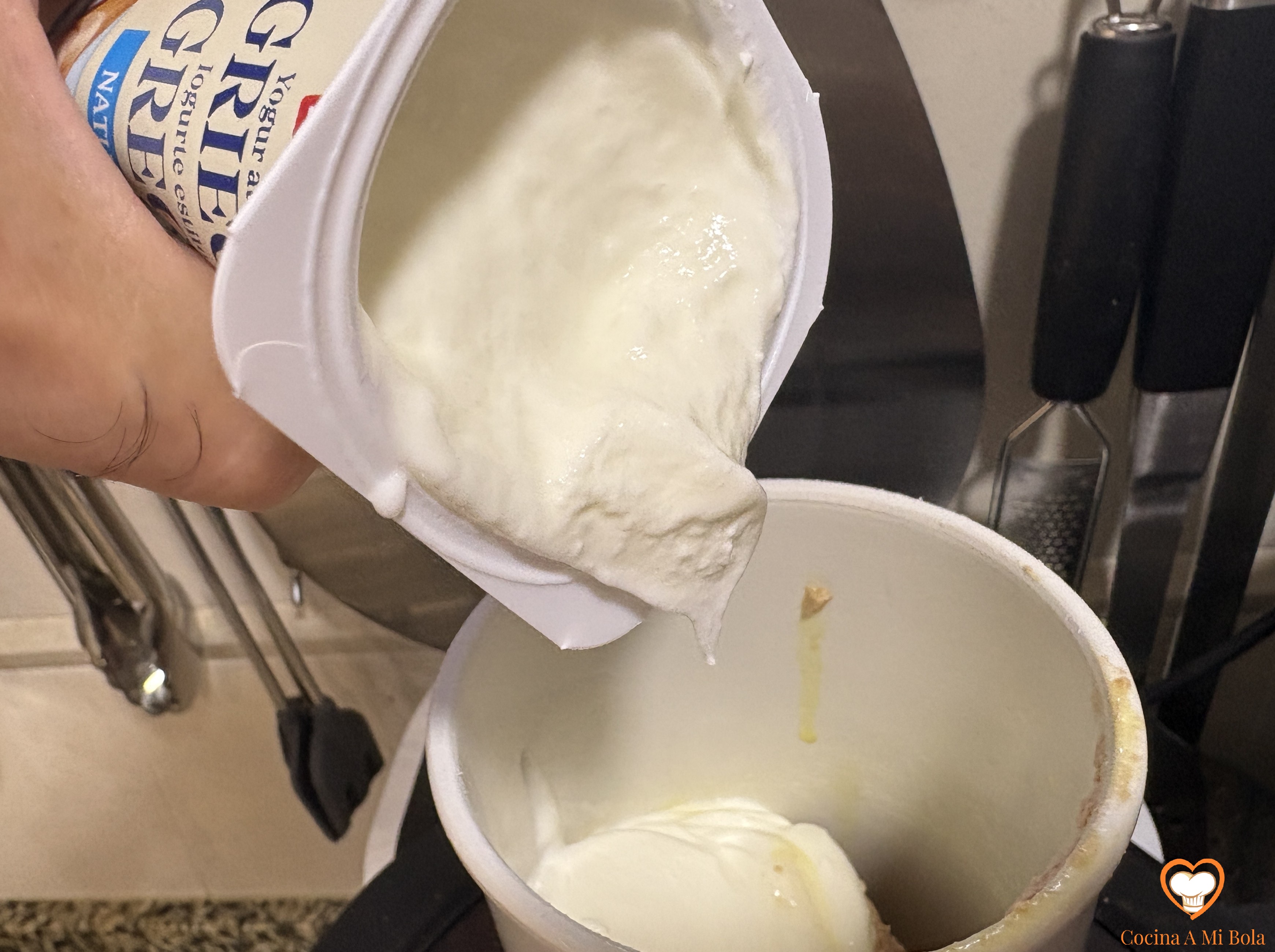 SEGUNDO.- Vierte 150 gr de foie micuit ya atemperado en un vaso batidor y añade el yogur griego natural. Es importante que sea sin edulcorar, porque azúcares ya va a llevar bastantes.
