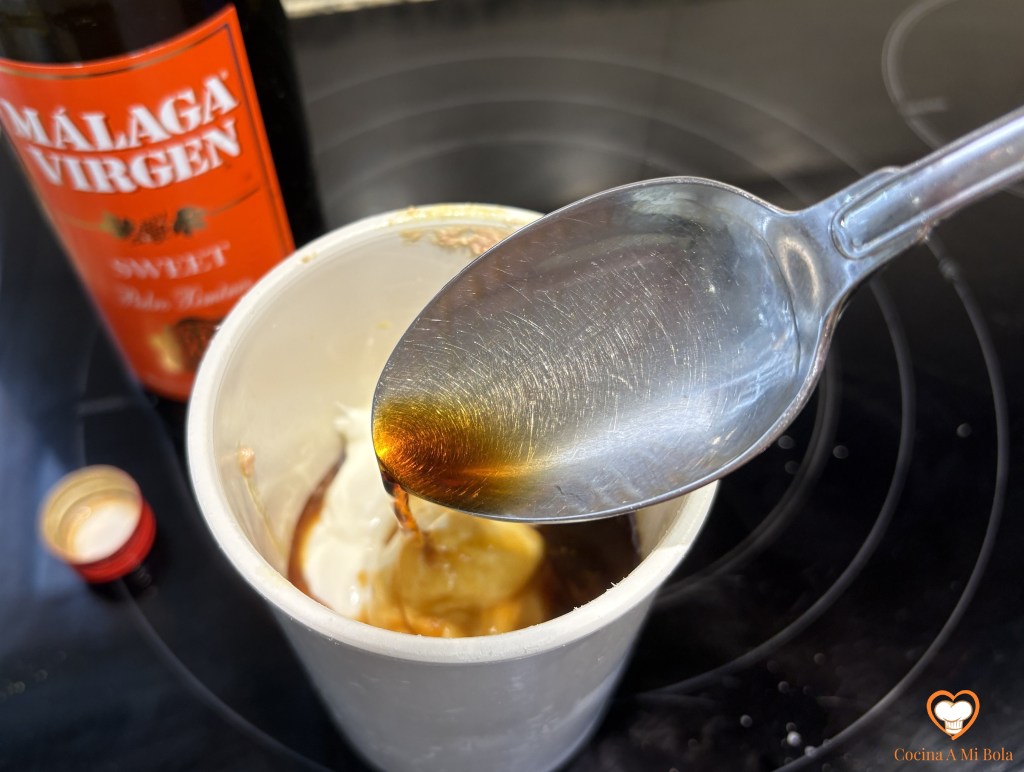TERCERO.- Agrega cuatro cucharadas soperas de vino Málaga Virgen, que para quienes no lo sepan, les diré que se trata de un vino de licor malagueño de la variedad Pedro Ximénez. No te excedas de esta cantidad porque he hecho algunas pruebas y tiende a imponerse sobre la suavidad del foie. Ponle dos pellizcos de sal y ¼ cucharadita de pimienta negra molida.
