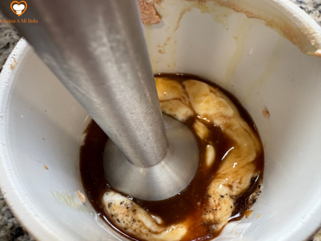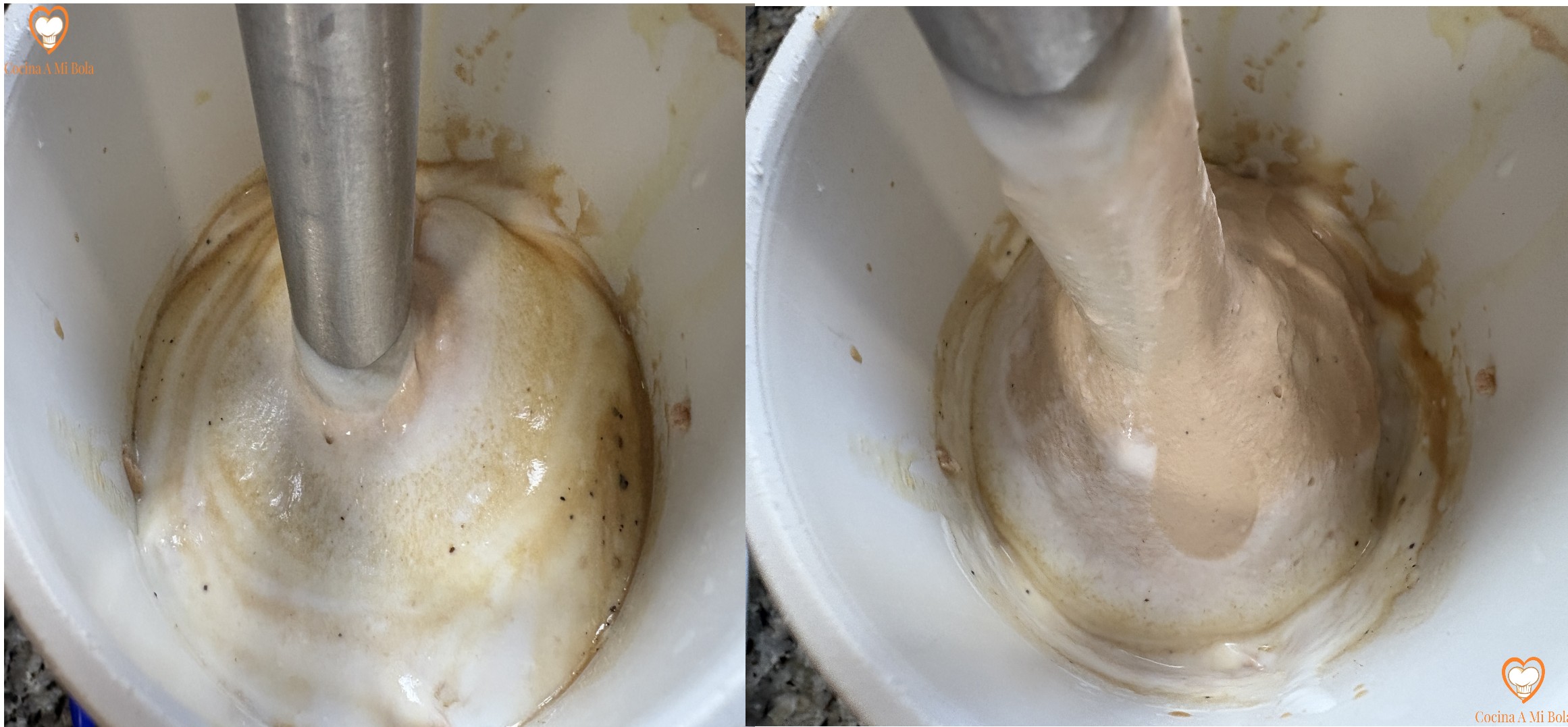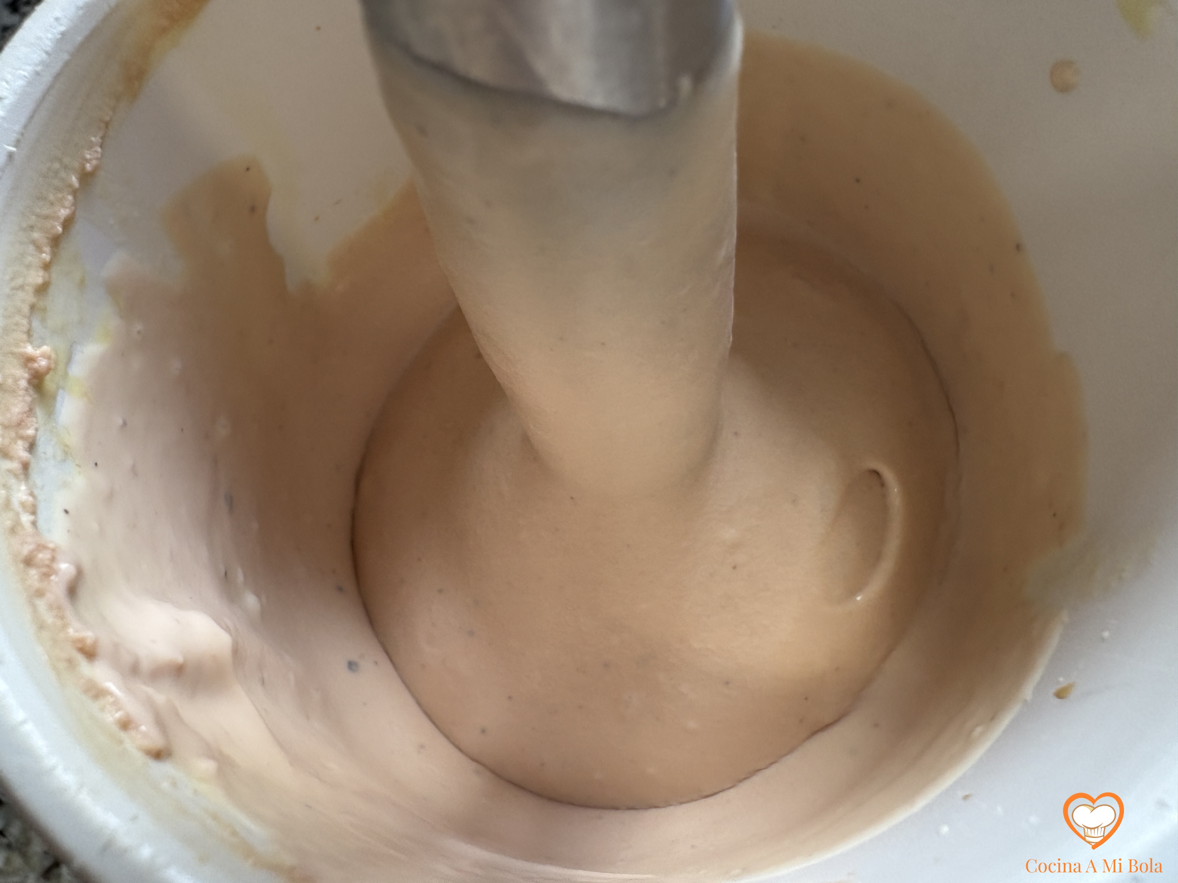 CUARTO.- Comienza a batirlo a una velocidad moderada hasta que se integren todos los ingredientes completamente, y obtengas una crema de textura media color café con leche.